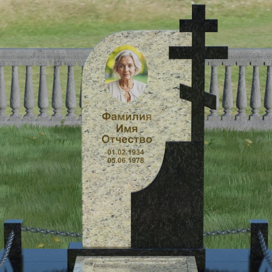 Игра контрастов — главная эстетическая особенность этого изделия. Сочетание глубокого темного камня с зеркальной полировкой и более светлого, фактурного гранита создает визуальный объем и подчеркивает торжественность момента. Такая форма идеально подходит для выражения скорби через красоту и долговечность. Плавные линии резьбы на переходе между элементами напоминают о том, что память о человеке не имеет острых углов, она течет сквозь время, оставаясь неизменной и чистой.
