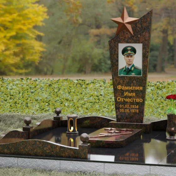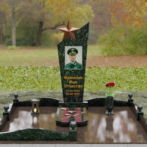 Основу композиции составляет массивное каменное полотно с уникальной асимметричной геометрией. Верхний край обелиска уходит в резкий диагональный подъем, создавая динамичный силуэт, устремленный к небесам. Венчает эту вершину объемная пятиконечная звезда — символ, выполненный в теплом бронзовом оттенке, который эффектно контрастирует с основным цветом камня. Зеркальная полировка лицевой грани доведена до эталонного блеска: поверхность буквально оживает, отражая окружающий мир и создавая глубину, в которой запечатлен портрет. Прямые, строгие линии боковых граней подчеркнуты аккуратными фасками, что придает всей конструкции архитектурную завершенность и визуальную легкость при сохранении колоссальной физической прочности.