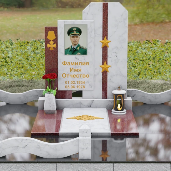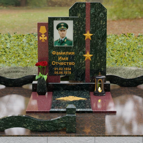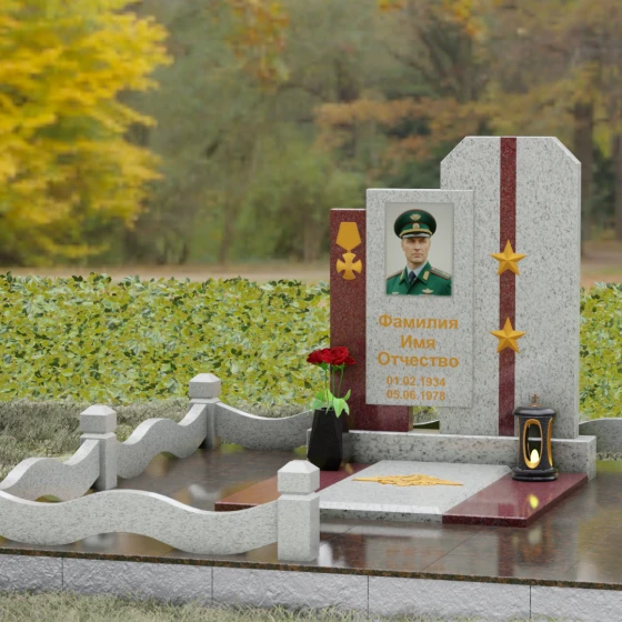 Выбор мемориального комплекса — это всегда поиск баланса между строгостью формы и глубиной чувств. Модель Артикул 201 представляет собой сложную архитектурную композицию, которая идеально подходит для увековечивания памяти сильного, волевого человека, посвятившего жизнь служению. Надгробие из натурального камня состоит из трех вертикальных элементов, создающих динамичный, ступенчатый силуэт. Центральная стела, предназначенная для размещения портрета и основной информации, обрамлена боковыми пилонами из контрастного красного гранита. Такая геометрия символизирует устойчивость, надежную опору и непоколебимость духа. Сочетание строгих прямых линий и аккуратных фасок на вершинах придает памятнику торжественный, парадный вид, подчеркивая заслуги и особый статус усопшего.