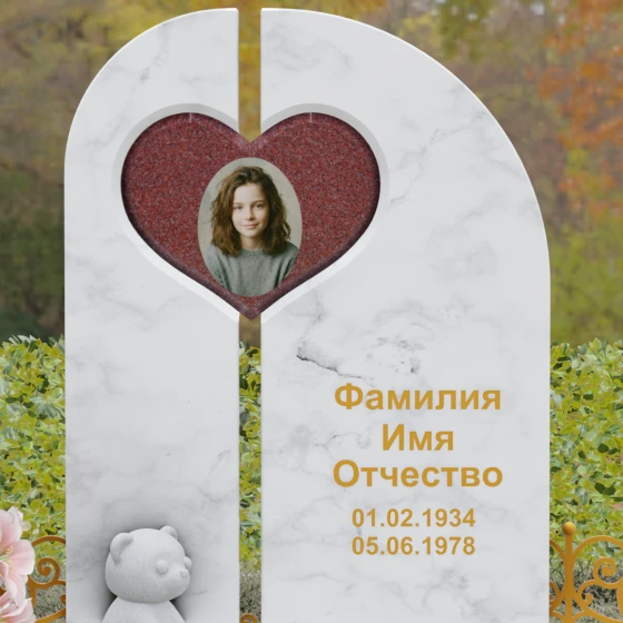 Особое внимание в данной модели уделено интеграции портрета. Ниша в форме сердца, расположенная в левой части композиции, является идеальным обрамлением для керамического фото или гравировки. Такое расположение акцентирует внимание на образе близкого человека, защищая его визуально «внутри» камня. Правая часть обелиска предназначена для лаконичного нанесения имени и дат, которые могут быть выполнены сусальным золотом или глубокой пескоструйной гравировкой, что идеально контрастирует с полированной поверхностью.