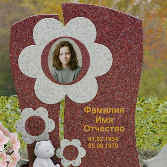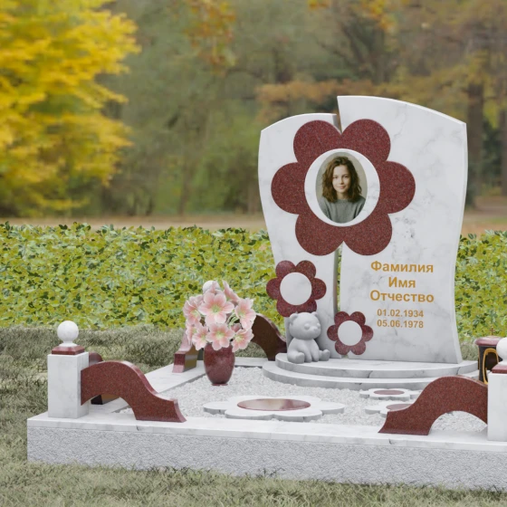 Представленный мемориальный ансамбль (Артикул 241) — это не просто памятник, а подлинное художественное произведение, в котором застыла нежность и вечная весна. В центре композиции находится величественная стела, выполненная в уникальной комбинированной технике. Ее асимметричная форма с деликатным вертикальным разделением создает динамичный и в то же время гармоничный силуэт. Главным акцентом является искусно вырезанный из камня цветок, в сердцевину которого помещен портрет. Плавные, округлые лепестки символизируют чистоту и хрупкость жизни, а их объемная фактура создает удивительную игру света и тени, контрастируя с глубокой зеркальной полировкой основного полотна стелы.