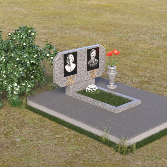 Композиция памятника строится на контрасте строгих геометрических форм и плавных линий, символизирующих жизненный путь и обретение покоя. Стела имеет форму, близкую к прямоугольнику, но с элегантно скошенными углами, смягчающими ее строгость. Верхняя часть стелы имеет две небольшие грани, словно фацеты драгоценного камня, добавляющие ей изысканности. Поверхность камня отполирована до зеркального блеска, что подчеркивает глубину черного цвета и создает ощущение торжественности. На лицевой стороне размещены портреты усопших, выполненные с высокой степенью детализации. Ниже портретов выгравированы надписи, выполненные строгим шрифтом. Справа от стелы установлена небольшая ваза, выполненная в том же стиле, что и памятник, и украшенная простым, но элегантным орнаментом.