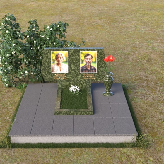 Представляем вам ритуальное изделие – памятник на могилу (Артикул: ПГ018), архитектурное решение, в котором строгость линий сочетается с глубоким символизмом. Это не просто надгробие, а осязаемое воплощение уважения и вечной памяти об ушедшем человеке. Стела, выполненная в форме сдержанного прямоугольника, слегка расширяющегося кверху, символизирует восхождение души к небесам. Грани камня тщательно обработаны, создавая игру света и тени, подчеркивающую монументальность и значимость этого места памяти. Слева и справа, верхние углы стелы имеют элегантные скосы, смягчающие строгость формы и придающие ей утонченность. На зеркальной поверхности камня выгравированы портреты усопших, их имена и даты жизни, выполненные с безупречной точностью и вниманием к деталям. Под портретами располагаются лаконичные надписи, выполненные строгим шрифтом, добавляющие памятнику сдержанности и достоинства. Дополнительная горизонтальная плита, расположенная перед стелой, создает ощущение завершенности и служит местом для возложения цветов или свечей. Этот элемент композиции выполнен в той же стилистике, что и основная стела, поддерживая общую гармонию и пропорциональность мемориального комплекса.