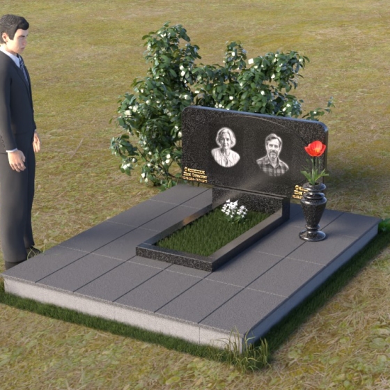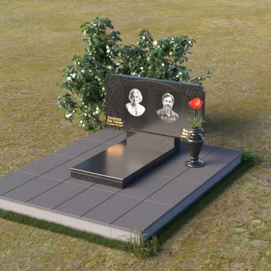 Форма стелы этого ритуального изделия идеально подходит для размещения двух портретов. Композиция с двумя изображениями, выполненными в технике гравировки, выглядит гармонично и сбалансированно. Под портретами можно расположить надпись с именем, датами жизни и короткой эпитафией. Золотое тиснение букв на черном граните создает эффект контраста и придает тексту дополнительную выразительность. Небольшая тумба, расположенная под стелой, служит подставкой для плиты с именами и годами жизни. Рядом с памятником можно установить вазу для цветов, выполненную в том же стиле и из того же материала, что и сам памятник. Это создаст единый ансамбль и подчеркнет целостность композиции. Дополнительно можно установить лампаду или небольшой фонарь, которые будут освещать памятник в темное время суток, создавая атмосферу умиротворения и светлой памяти.
