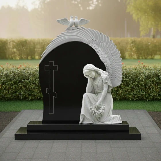 Гранитный монумент (Артикул: ПН 042) представляет собой глубокое художественное произведение, воплощающее вечную скорбь и светлую память. Его дизайн не просто отражает эстетику, но и погружает в мир символов, говорящих о любви, утрате и надежде. Центральный элемент композиции — это массивное вертикальное надгробие, выполненное в форме арки, словно обнимающей пространство памяти. Его левая грань обработана с идеальной полировкой, создающей зеркальную поверхность глубокого черного цвета, которая, словно бездонное зеркало, отражает мир, призывая к созерцанию. На этой полированной поверхности выгравирован лаконичный православный крест, чей строгий абрис с дополнительной нижней перекладиной, символизирующей подножие, и верхней короткой табличкой, выполнен в технике, которая позволяет ему слегка выступать над основной плоскостью, создавая эффект игры света и тени. Правая часть надгробия имеет плавный, волнообразный изгиб, переходящий в объемную резьбу, изображающую крыло. Каждое перо этого крыла вырезано с потрясающей детализацией, его матовая, светлая поверхность контрастирует с глубоким черным фоном, создавая ощущение легкости и невесомости. Эта игра контрастов — между блеском полированного гранита и матовой фактурой резьбы — придает монументу невероятный объем и глубину, заставляя его оживать под лучами света. Венчает композицию изящная скульптура, изображающая скорбящего ангела, преклонившего колени. Его фигура, выполненная из светлого камня, словно излучает внутренний свет, подчеркивая нежность и уязвимость. Голова ангела склонена, руки сложены на груди, в них он держит венок из цветов, каждый лепесток которых тщательно проработан, придавая венку реалистичный и трогательный вид. Над аркой, на ее вершине, расположены две белые голубки, символизирующие чистоту души и мир. Их фигуры выполнены в матовом светлом камне, что еще больше подчеркивает их символическое значение. Весь ансамбль покоится на двухступенчатом основании из черного полированного гранита, которое придает монументу устойчивость и завершенный вид. Контраст между матовыми элементами резьбы и блеском полированного камня создает удивительную игру света и тени, которая меняется в зависимости от освещения, придавая монументу динамичность и глубину. Это не просто памятник, это произведение искусства, которое говорит о вечных ценностях, о скорби и надежде, о памяти, которая живет в сердцах. Благоустройство участка выполнено с той же тщательностью и вниманием к деталям. Монумент установлен на массивный гранитный цоколь, придающий конструкции устойчивость и монументальность. Надгробная плита, выполненная в едином стиле со стелой, полностью покрывает пространство под памятником, создавая законченный и ухоженный вид, что значительно упрощает уход за местом захоронения. Отсутствие открытого грунта не только практично, но и эстетично, подчеркивая целостность композиции.