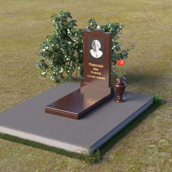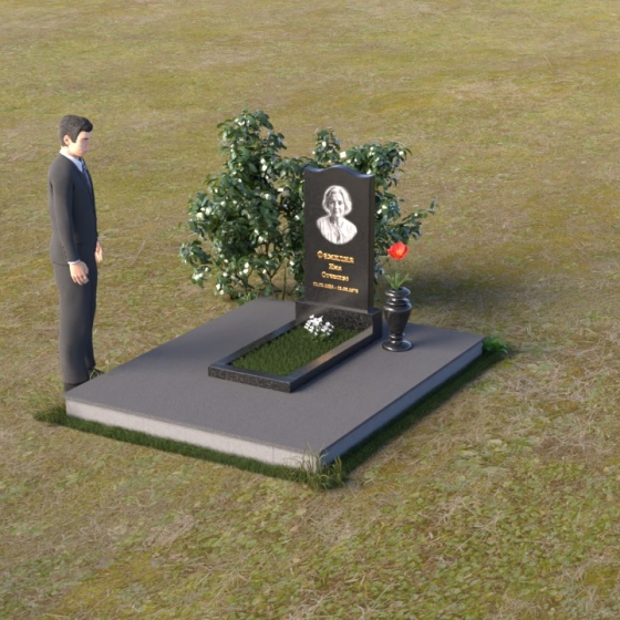Величественная стела памятника ПВ 008 представляет собой элегантное сочетание строгих линий и плавных изгибов. Верхняя часть стелы имеет волнообразную форму, смягчающую строгость камня и придающую ей утонченность. Грани стелы тщательно отполированы до зеркального блеска, отражая свет и создавая ощущение легкости и воздушности. На лицевой стороне стелы размещен портрет усопшего, выполненный методом гравировки. Ниже располагаются надпись с именем и датами жизни. Под стелой расположена горизонтальная плита, также выполненная из полированного гранита. Ее строгие прямоугольные формы контрастируют с плавными линиями стелы, подчеркивая ее выразительность. Фаски по периметру плиты смягчают углы и придают ей завершенный вид. Рядом со стелой установлена небольшая ваза из темного гранита с изящным орнаментом, предназначенная для живых цветов.