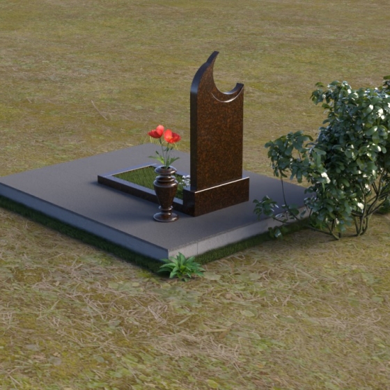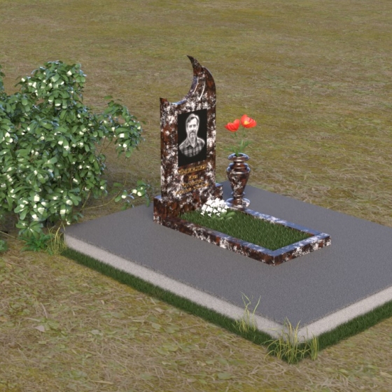 Этот гранитный монумент притягивает взгляд своей необычной формой. Основной элемент – вертикальная плита, увенчанная плавной, асимметричной дугой, напоминающей полумесяц. Её левая сторона чуть выше правой, что создает ощущение динамики и незавершенности, словно оборвавшейся жизни. Поверхность лицевой стороны отполирована до зеркального блеска, отражая небо и окружающий пейзаж, создавая иллюзию глубины и пространства. На полированной поверхности выгравирован портрет усопшего, надпись с именем и датами жизни. Нижняя часть монумента, сопрягаясь с горизонтальной плитой, образует единый ансамбль. Переход между вертикальной и горизонтальной плоскостями подчеркнут небольшой ступенькой, добавляющей конструкции объема. Горизонтальная плита, в свою очередь, также отполирована до блеска, отражая свет и усиливая эффект монументальности. Фаски на гранях плиты аккуратно обработаны, что придает памятнику завершенный и элегантный вид. Сбоку от монумента расположена небольшая гранитная ваза, предназначенная для живых цветов, которые станут символом вечной памяти и любви.