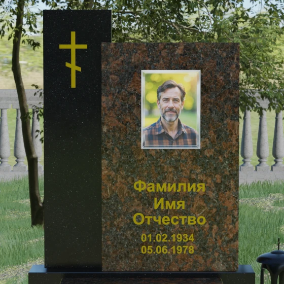 Визуальное решение данного мемориала строится на благородном контрасте двух вертикальных элементов, что позволяет создать глубокий и многогранный художественный образ. Композиция состоит из двух стел разной высоты, установленных внахлест. Более высокая и узкая стела служит духовным стержнем комплекса: на её полированной поверхности закреплен лаконичный православный крест. Его строгие линии и золотистое покрытие подчеркивают святость места и символизируют надежду на вечную жизнь. Широкая основная панель выступает в качестве смыслового центра, где располагается портрет и основные памятные надписи. Использование фотокерамики или портрета на стекле в специальной нише придает образу особую четкость и глубину, гармонируя с зеркальной поверхностью камня.
