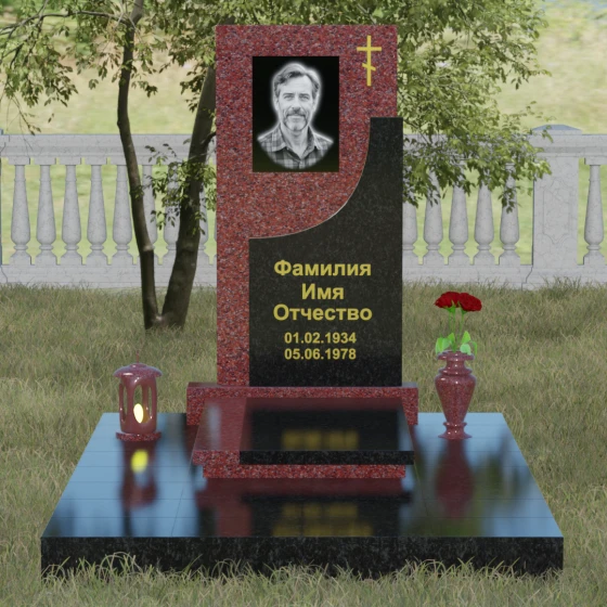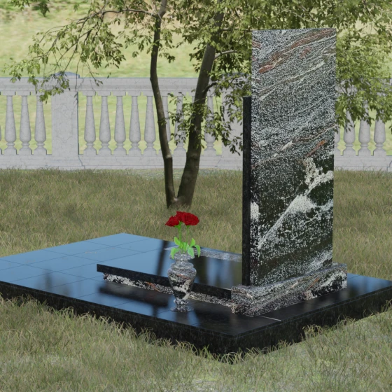 Модель Артикул 024 представляет собой законченное архитектурное решение. Стела установлена на массивный гранитный цоколь, который служит надежным фундаментом и придает всей конструкции необходимую устойчивость. Важной особенностью данного проекта является полное мощение участка: вместо открытого грунта используется сплошная надгробная плита. Это не только создает эстетически безупречный, аккуратный вид, но и значительно упрощает уход за местом захоронения, избавляя от необходимости борьбы с сорняками. В едином стиле с основным монументом выполнены дополнительные элементы декора: изящная каменная ваза, установленная на плите, позволяет приносить живые цветы, сохраняя гармонию композиции. Каменный бордюр по периметру участка четко очерчивает границы мемориала, превращая его в уединенное место для тихой молитвы и воспоминаний.