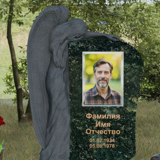 Центральным художественным элементом композиции является искусная скульптура скорбящего ангела, выполненная в технике глубокого барельефа. Фигура небесного защитника органично интегрирована в левую часть каменного полотна. Мы видим детальную проработку каждого перышка на опущенных крыльях, мягкие, ниспадающие складки плащаницы и кроткий изгиб шеи — ангел склонил голову в знак вечного сострадания. Особого внимания заслуживает игра фактур: матовая, бархатистая поверхность резной фигуры контрастирует с безупречным зеркальным блеском основной плоскости, на которой располагается портрет и эпитафия. Такая полировка создает эффект глубокого черного или цветного зеркала, в котором отражается небо, символизируя связь между земным и небесным.