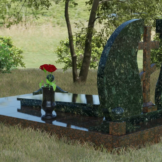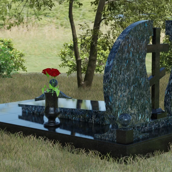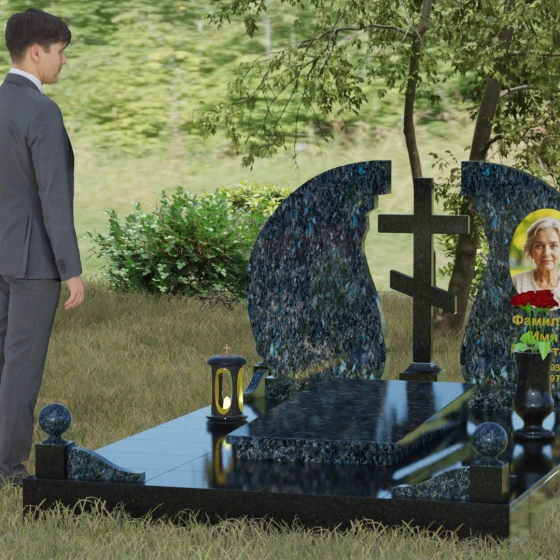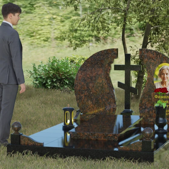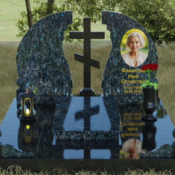 Мемориальный ансамбль (Артикул 066) — это не просто памятный знак, а глубоко продуманная художественная композиция, символизирующая вечный покой и небесное покровительство. Центром этого изысканного ансамбля является величественная стела, состоящая из двух симметричных полотен. Грация форм здесь сочетается с глубоким символизмом: плавные, волнообразные изгибы внутренних граней камня напоминают крылья ангела или раскрытую книгу жизни. Между двумя частями композиции возвышается восьмиконечный православный крест, выполненный из контрастного камня, что акцентирует внимание на духовной составляющей и непоколебимой вере.