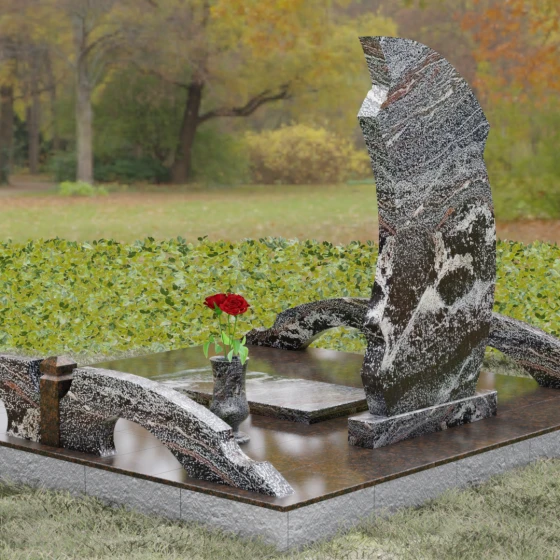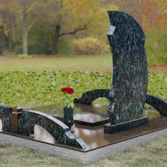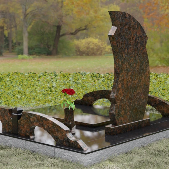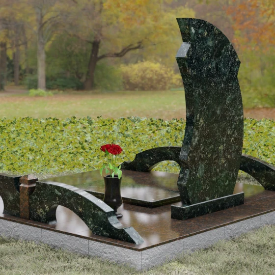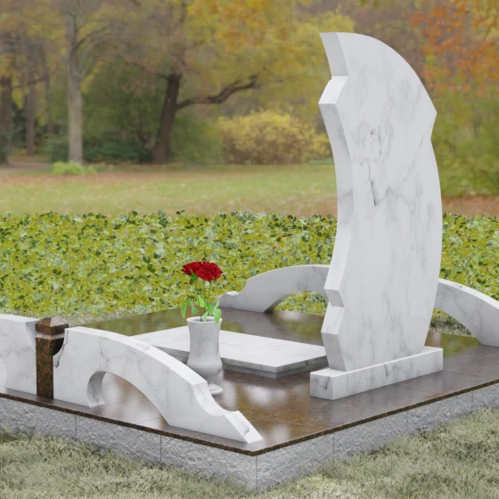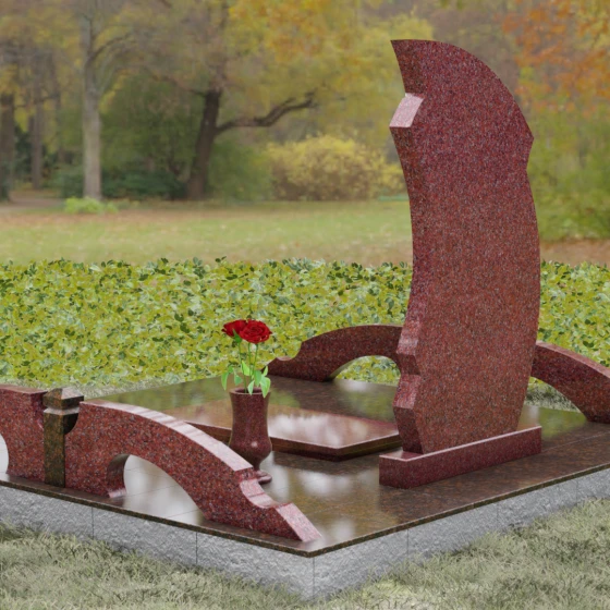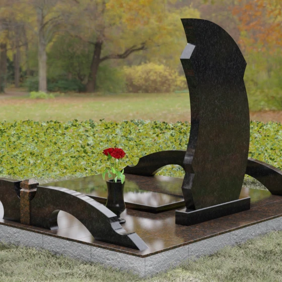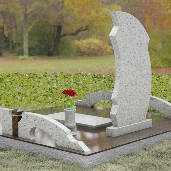 Выбор мемориального комплекса — это всегда поиск баланса между эстетикой, долговечностью и выражением тех чувств, которые остались в сердце. Модель под артикулом 122 представляет собой уникальное сочетание современного стиля и классической монументальности. В центре композиции находится величественная стела, чья асимметричная форма приковывает взгляд. Плавный, почти поэтичный изгиб одной из граней напоминает застывшую волну или лепесток, стремящийся ввысь, что символизирует вечное движение души и неразрывную связь между земным и небесным миром. Верхняя часть монумента украшена изящным декоративным вырезом, который придает камню легкость, несмотря на его внушительный вес и объем.