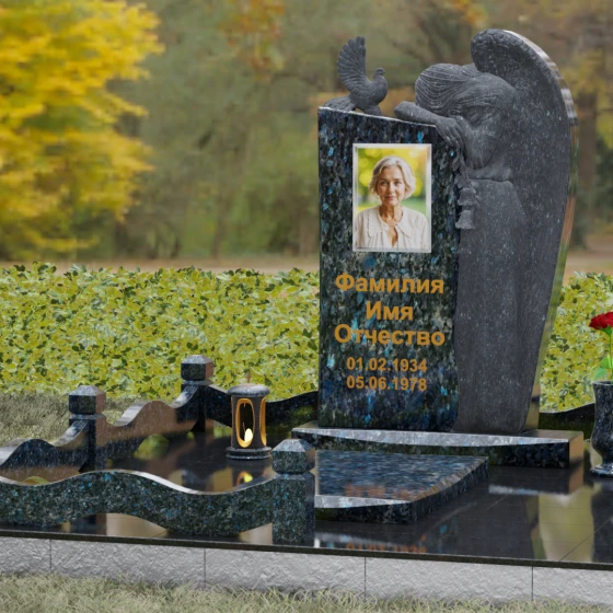 Верхний контур монумента украшен реалистичной фигуркой голубя, символизирующего чистоту души и мир. Композиция выстроена на игре фактур: идеально гладкий, иссиня-черный гранит отражает окружающий мир, в то время как резные элементы имеют благородную шероховатость, подчеркивающую природную суть материала. Форма стелы асимметрична, что придает всему комплексу динамику и современный вид в стиле модерн, сохраняя при этом торжественную монументальность.