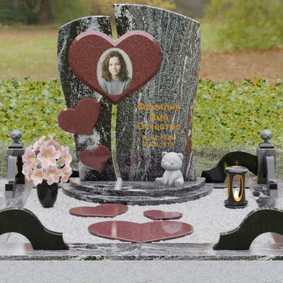 Оформление: Уникальная геометрия этого надгробия сама подсказывает идеальное расположение гравировки. Крупное центральное сердце словно создано для размещения портрета — здесь он будет главным смысловым акцентом, защищенным символом любви. Правую, более широкую часть плиты, рекомендуется использовать для нанесения Фамилии, Имени, Отчества и дат жизни. Здесь же останется достаточно места для проникновенной эпитафии или дополнительного декоративного элемента, например, небольшой виньетки или креста.