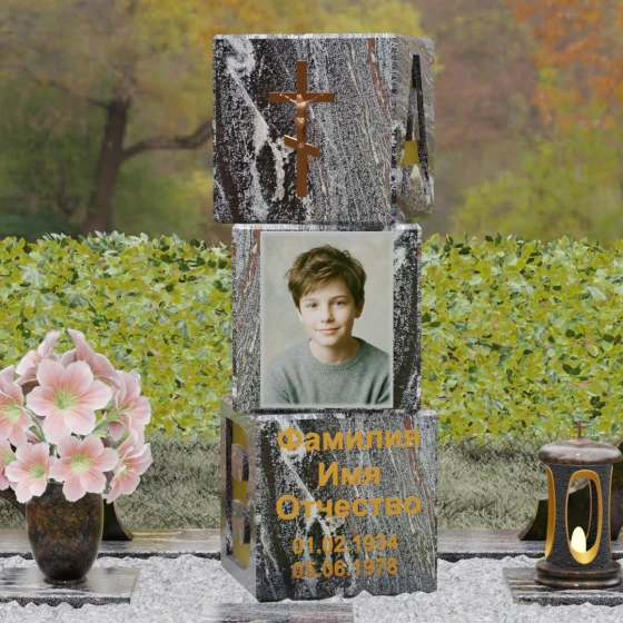 Представленное надгробие из натурального камня (Артикул: 142) — это не просто памятный знак, а монументальное архитектурное произведение, выполненное в стиле современного мемориального минимализма. В отличие от стандартных решений, данная модель представляет собой композицию из трех массивных кубических блоков, установленных друг на друга. Такая форма символизирует устойчивость, многогранность человеческой жизни и незыблемость семейного фундамента. Каждая грань камня подвергнута безупречной зеркальной полировке, которая создает глубокую игру света и отражений, подчеркивая природную чистоту материала.