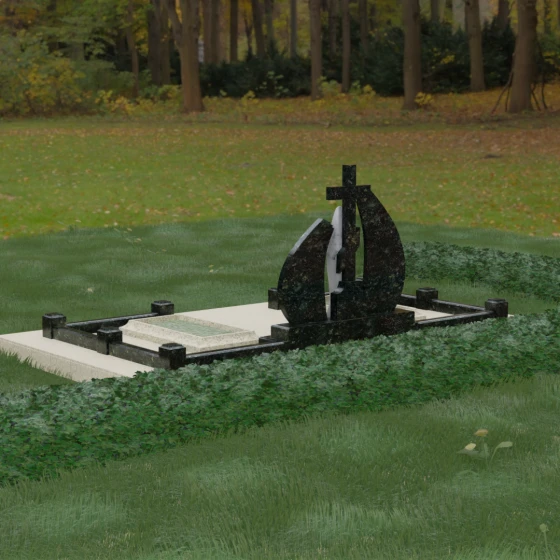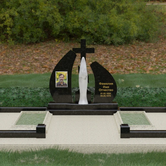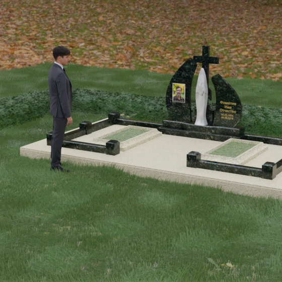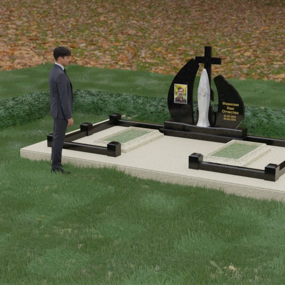 Особое внимание привлекает игра фактур: идеально гладкая, зеркальная полировка основных плоскостей камня соседствует с матовым, бархатистым исполнением центральной статуи. Такое сочетание позволяет свету играть на гранях мемориального комплекса, создавая глубокие тени и яркие блики, что придает всей конструкции дополнительный объем и монументальность. Это решение подчеркивает статусность мемориала и его эстетическое совершенство, делая его доминантой на месте захоронения.
