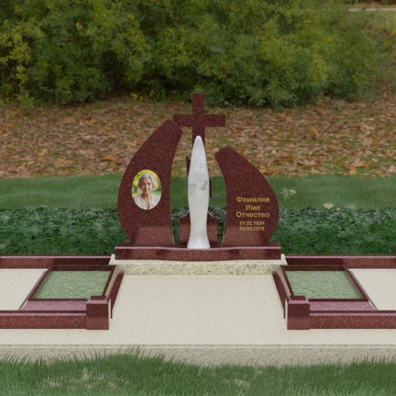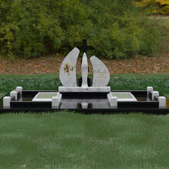 Эта величественная стела представляет собой не просто мемориальный знак, а глубоко продуманную художественную композицию, в которой каждая линия наполнена смыслом. Центральным элементом мемориала является изящная скульптура Скорбящей матери, выполненная в мягком белом цвете. Её плавный силуэт, напоминающий застывшую молитву, контрастирует со строгим и лаконичным православным крестом, венчающим композицию. Форма боковых элементов стелы напоминает два крыла или два лепестка пламени, которые бережно обрамляют центральную фигуру, создавая ощущение защиты и вечного покоя.