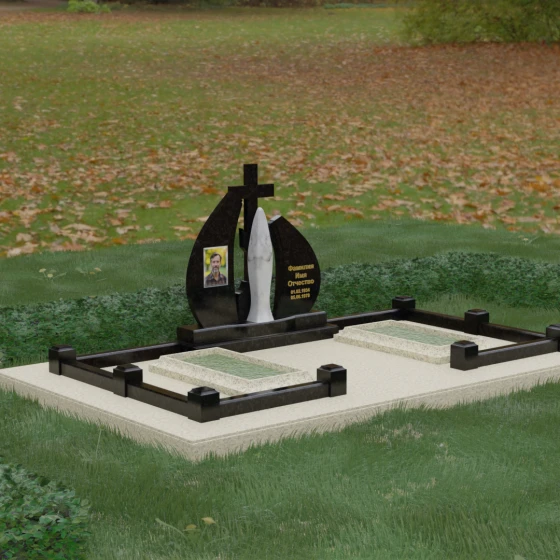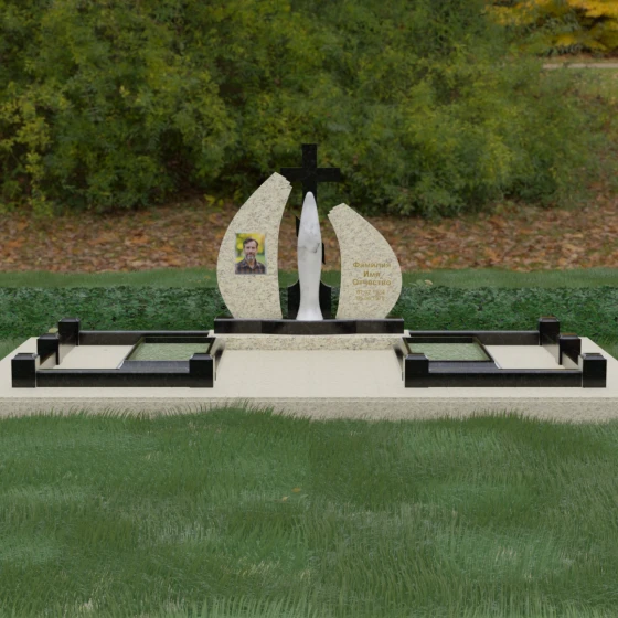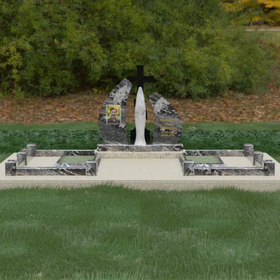 Внутри периметра предусмотрены два симметричных открытых цветника, которые позволяют внести живые краски в строгую геометрию камня. Конструкция стелы идеально сбалансирована для размещения парных портретов или надписей. Левое «крыло» традиционно отводится под гравировку портрета, где на темном полированном фоне изображение будет выглядеть максимально четким и контрастным. Правая часть предназначена для эпитафии и имен, нанесенных глубокой гравировкой с возможным золочением букв. Весь ансамбль продуман так, чтобы передать теплоту ваших чувств и сохранить память о дорогих людях в самом достойном виде.