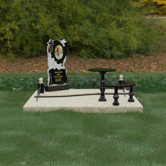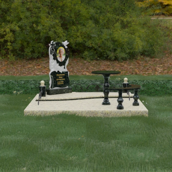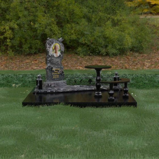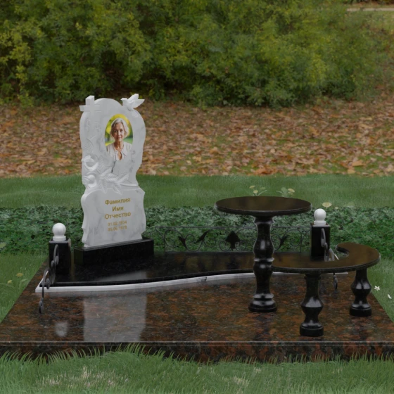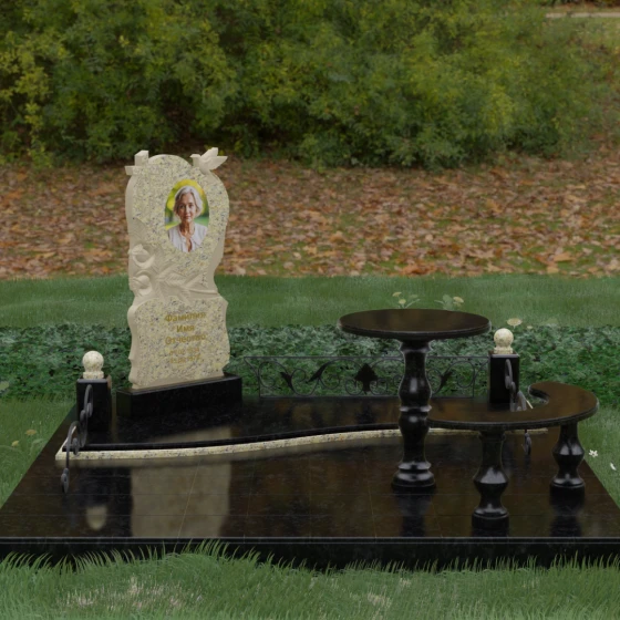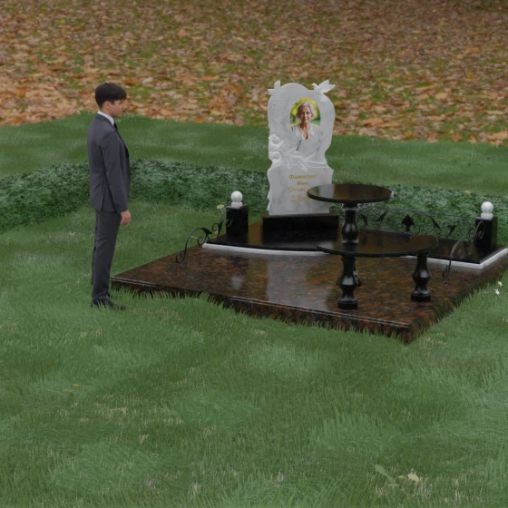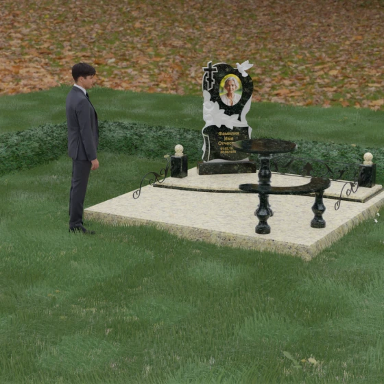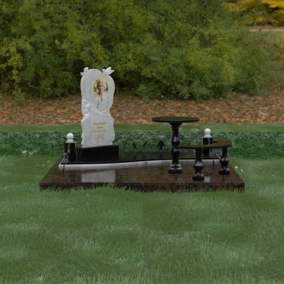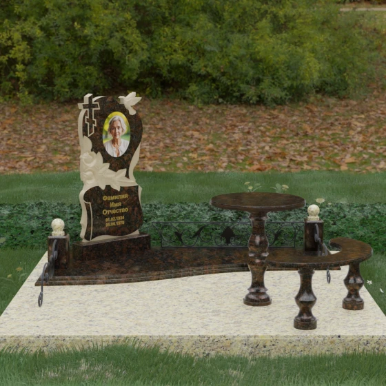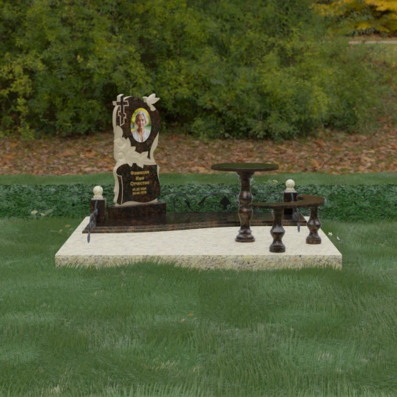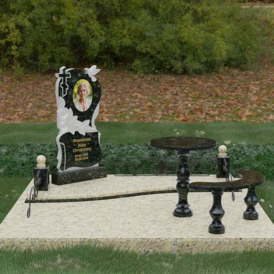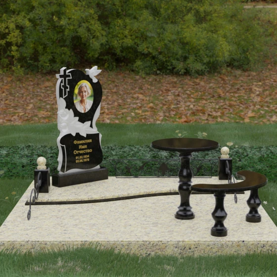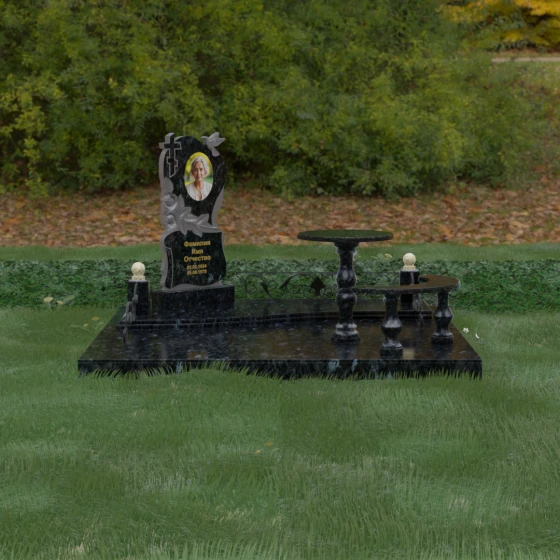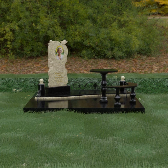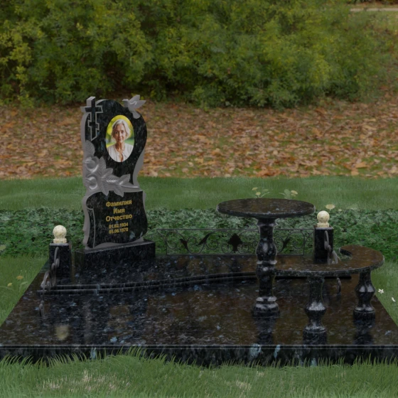 Нижняя часть стелы украшена пышными розами, лепестки которых проработаны с исключительным мастерством: объемная резьба передает нежность каждого бутона, создавая эффект живых цветов, застывших в вечности. Благоустройство участка выполнено по европейскому стандарту «полного мощения». Светлая гранитная плита с уникальной зернистой фактурой полностью перекрывает участок, создавая безупречно аккуратный вид и освобождая от необходимости регулярной борьбы с сорняками. В единый ансамбль включены массивный полированный столик и изящная полукруглая скамья на фигурных балясинах, что превращает место памяти в пространство для спокойного уединения и молитвы. Декоративные каменные столбики с навершиями в виде полированных шаров и кованые вставки по периметру подчеркивают монументальность и законченность всей композиции.