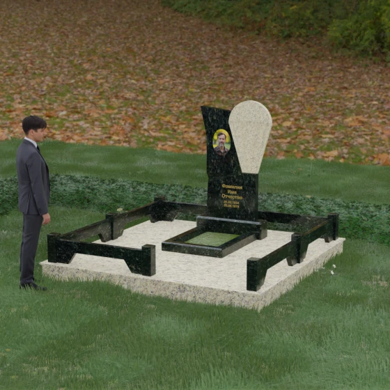 Данное ритуальное изделие представляет собой образец современной мемориальной пластики, где эстетика минимализма встречается с глубоким философским подтекстом. В центре композиции — сложная асимметричная стела, состоящая из двух контрастных элементов. Основная часть, выполненная из темного полированного камня, символизирует земную твердь и непоколебимую память, в то время как изящная светлая вставка в форме капли или воздушной сферы, устремленной вверх, олицетворяет чистоту души и её вечный полет. Игра света на зеркальных плоскостях создает динамичный объем: грани преломляют лучи, заставляя полированную поверхность «оживать» и менять глубину оттенка в зависимости от угла зрения. Этот ансамбль выбирают за его уникальную геометрию, которая выделяется на фоне классических форм, подчеркивая индивидуальность и высокий статус места захоронения.