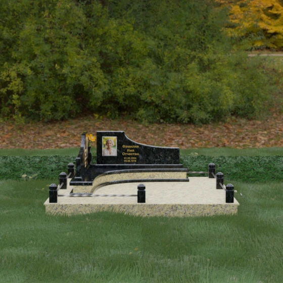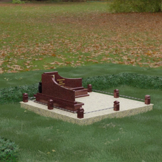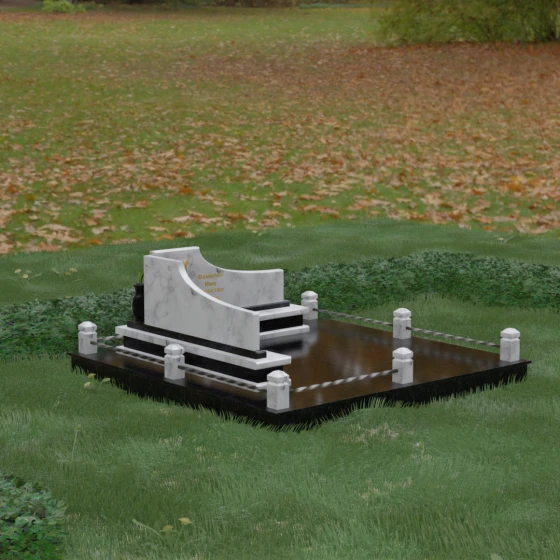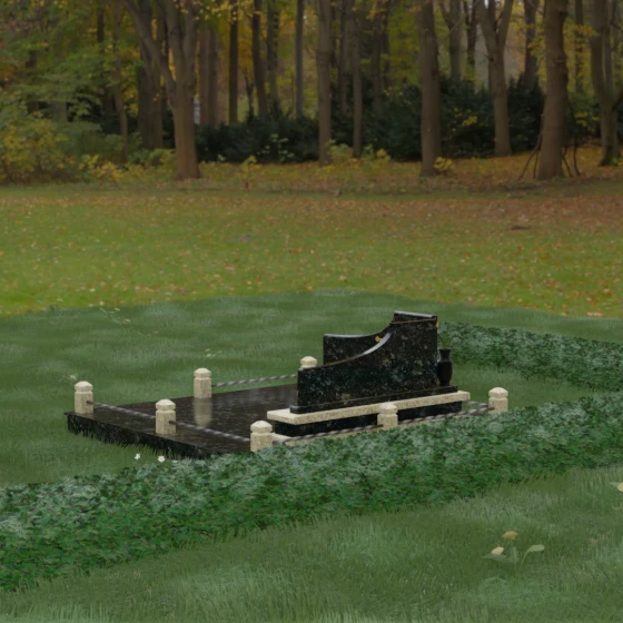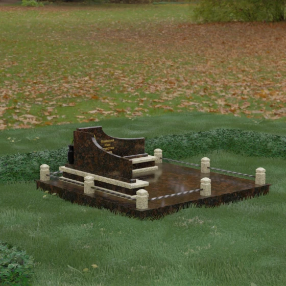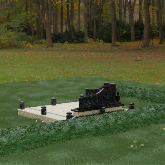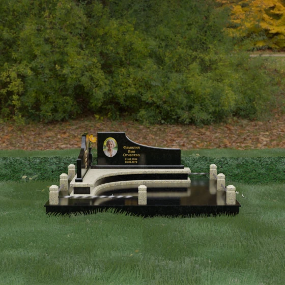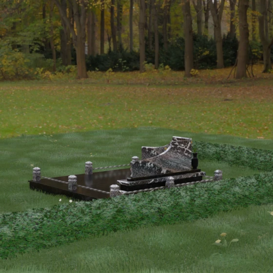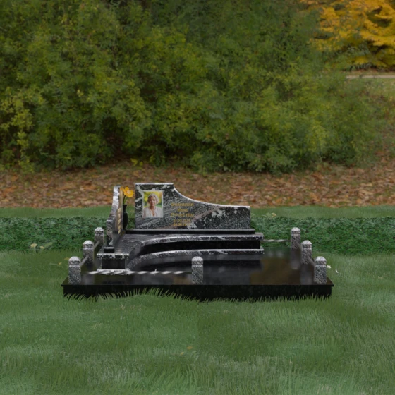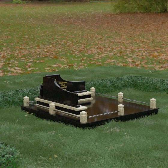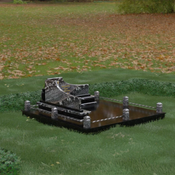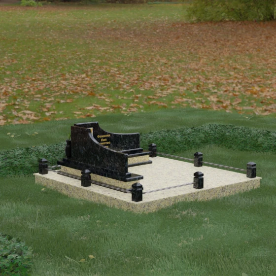 Особого внимания заслуживает горизонтальное благоустройство участка. Нижняя часть изваяния опирается на сложный трехступенчатый каскад из светлого гранита, который дублирует изгиб вертикальных плит. Этот подиум не только придает всей конструкции монументальную устойчивость, но и служит изысканным декоративным акцентом. Границы участка обозначены строгим каменным цоколем, по углам которого установлены восьмигранные столбики с декоративными навершиями. Между ними расположены изящные кованые ограждения, которые завершают ансамбль, делая его закрытым и защищенным от внешнего мира. Сплошная надгробная плита, закрывающая основание, обеспечивает безупречный вид участка на долгие годы, избавляя от необходимости сложного ухода.