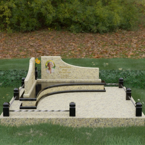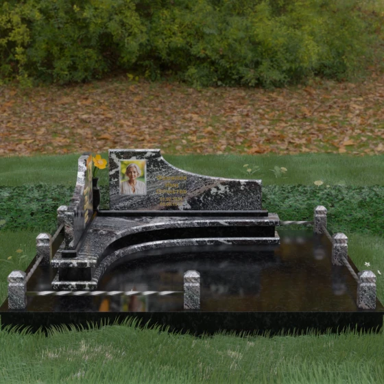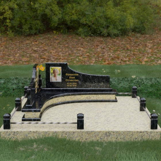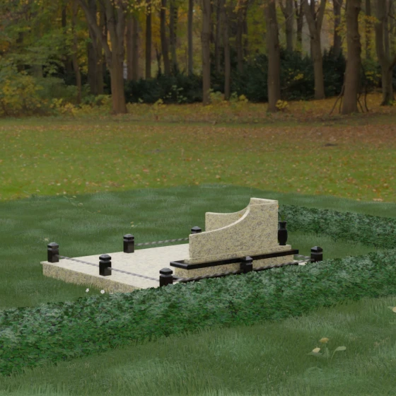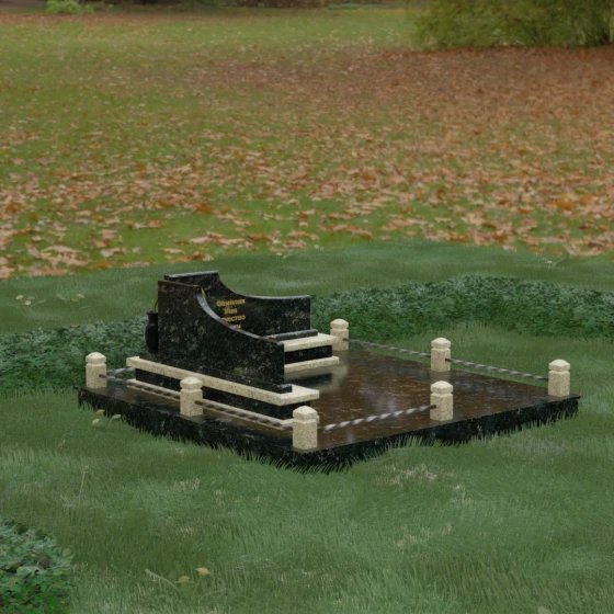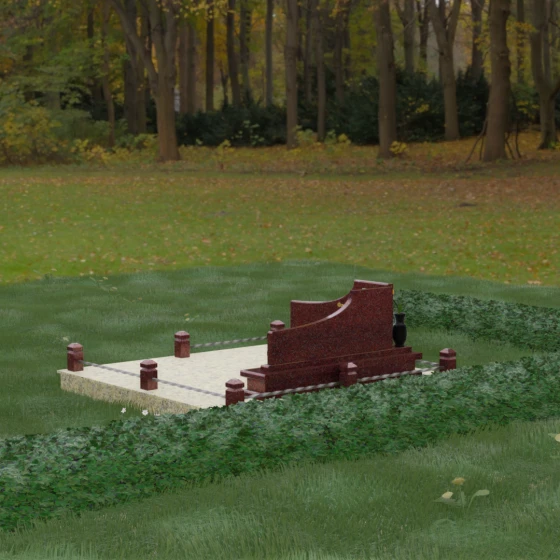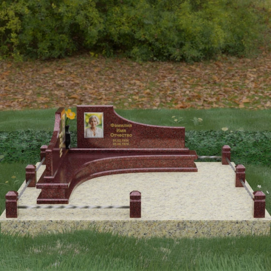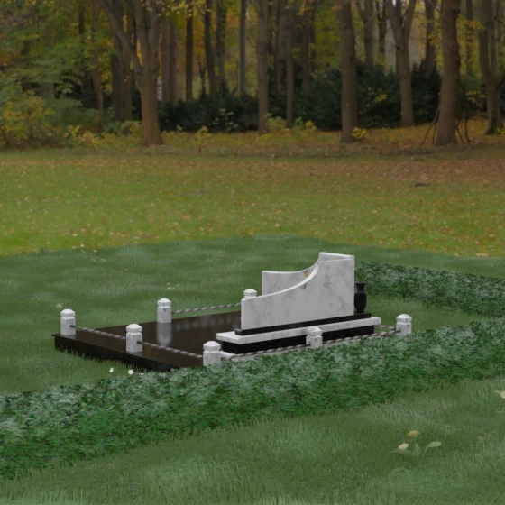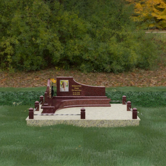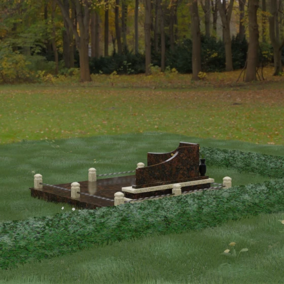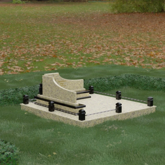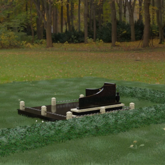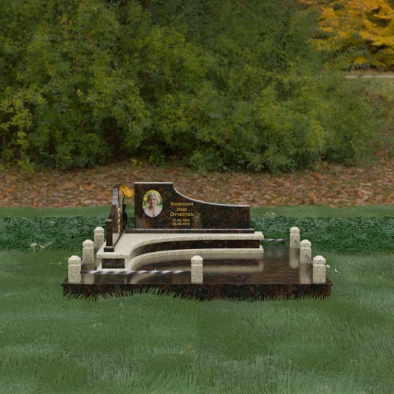 Особого внимания заслуживает горизонтальное благоустройство участка. Нижняя часть изваяния опирается на сложный трехступенчатый каскад из светлого гранита, который дублирует изгиб вертикальных плит. Этот подиум не только придает всей конструкции монументальную устойчивость, но и служит изысканным декоративным акцентом. Границы участка обозначены строгим каменным цоколем, по углам которого установлены восьмигранные столбики с декоративными навершиями. Между ними расположены изящные кованые ограждения, которые завершают ансамбль, делая его закрытым и защищенным от внешнего мира. Сплошная надгробная плита, закрывающая основание, обеспечивает безупречный вид участка на долгие годы, избавляя от необходимости сложного ухода.