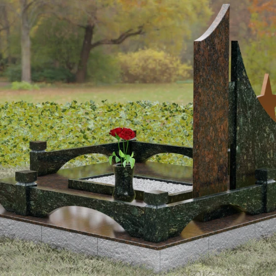 В основе художественной концепции лежит динамичная асимметрия, которая придает всей структуре современный, «европейский» облик. Центральная стела состоит из двух контрастных блоков, объединенных общим основанием. Левая часть, выполненная из темного полированного камня, имеет резкий диагональный срез, направленный вверх. На ее вершине закреплена объемная пятиконечная звезда с эффектом бронзового напыления — мощный акцент, подчеркивающий статус и заслуги покойного. Правая часть композиции представляет собой высокий вертикальный пилон из фактурного коричнево-красного гранита, на верхнем сегменте которого расположена детальная реплика ордена Мужества.