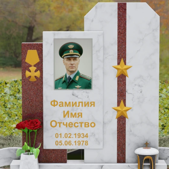 Выбор мемориального комплекса — это всегда поиск баланса между строгостью формы и глубиной чувств. Модель Артикул 201 представляет собой сложную архитектурную композицию, которая идеально подходит для увековечивания памяти сильного, волевого человека, посвятившего жизнь служению. Надгробие из натурального камня состоит из трех вертикальных элементов, создающих динамичный, ступенчатый силуэт. Центральная стела, предназначенная для размещения портрета и основной информации, обрамлена боковыми пилонами из контрастного красного гранита. Такая геометрия символизирует устойчивость, надежную опору и непоколебимость духа. Сочетание строгих прямых линий и аккуратных фасок на вершинах придает памятнику торжественный, парадный вид, подчеркивая заслуги и особый статус усопшего.