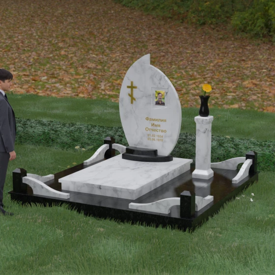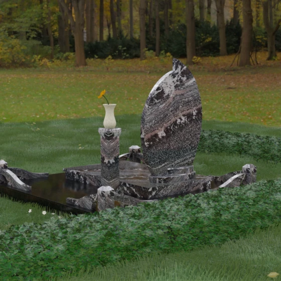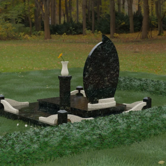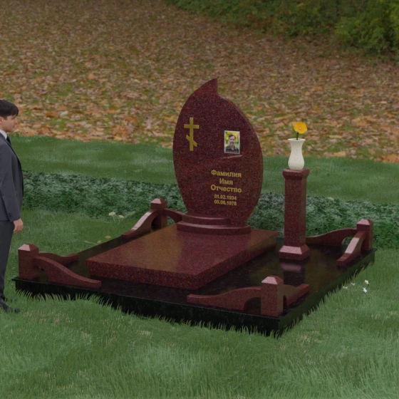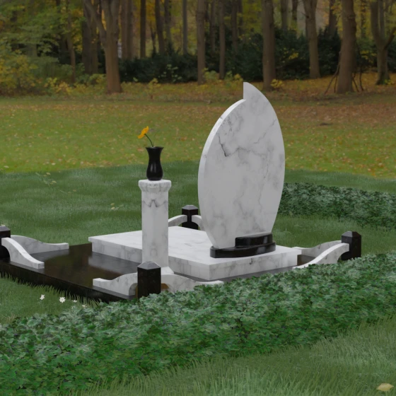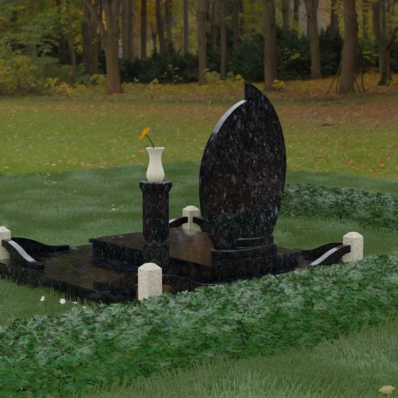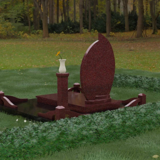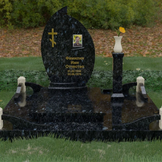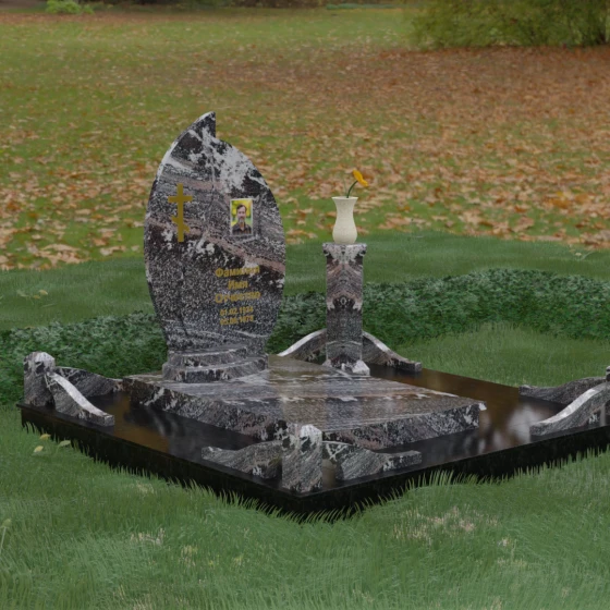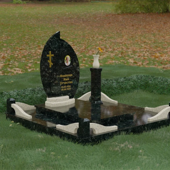 Выбор мемориального ансамбля — это всегда поиск баланса между эстетикой и долговечностью. Данная модель (Артикул 232) представляет собой сложную многокомпонентную композицию, центром которой является величественная стела, выполненная в уникальной асимметричной форме. Своими очертаниями она напоминает застывшее пламя или лепесток, устремленный ввысь, что символизирует вечную жизнь души и неугасаемую память близких. Плавный изгиб верхней грани завершается острым пиком, создавая динамичный и в то же время одухотворенный силуэт. Мастерская обработка камня позволяет добиться идеальной зеркальной полировки основной плоскости, которая эффектно контрастирует с матовыми светлыми элементами подставки и ограждения.