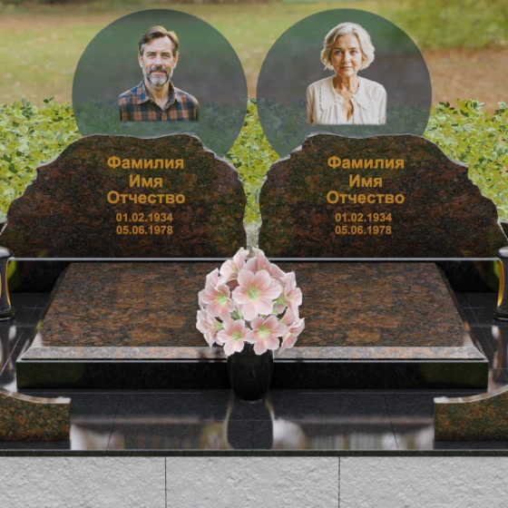 Данная мемориальная композиция представляет собой гармоничное сочетание природной силы и деликатной эстетики. В центре внимания — две величественные стелы, чьи навершия выполнены в форме идеальных полусфер, напоминающих заходящее солнце или две души, неразрывно связанные временем. Особое благородство этому изваянию придает контрастная обработка граней: если лицевая поверхность доведена до безупречного зеркального блеска, то боковые и нижние части камня оставлены в необработанном, "скальном" виде. Эта фактурная резьба, имитирующая естественный разлом горной породы, подчеркивает массивность и надежность конструкции, создавая ощущение вечности и непоколебимого покоя.