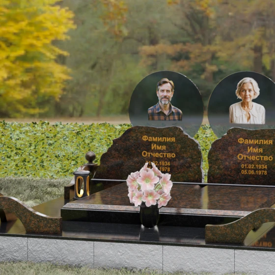 Геометрия стел с круглыми вставками идеально подходит для размещения портретов. Округлая форма фокуса притягивает взгляд к лицам, создавая эффект "окна в вечность". Здесь гармонично смотрится как классическая гравировка, так и цветная фотокерамика. Текст, нанесенный глубоким пескоструйным методом или выполненный в виде накладных букв, располагается в центральной части, оставаясь легко читаемым на фоне безупречной полировки. Мы понимаем, как важно сохранить каждую деталь образа, поэтому форма данного надгробия спроектирована так, чтобы художественное оформление выглядело максимально органично и статусно.