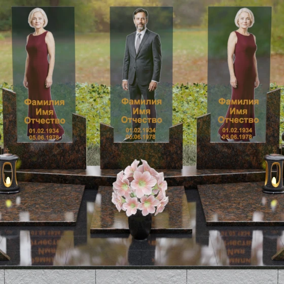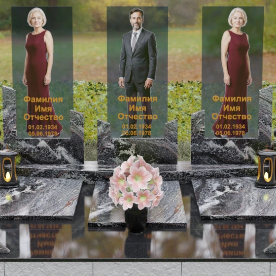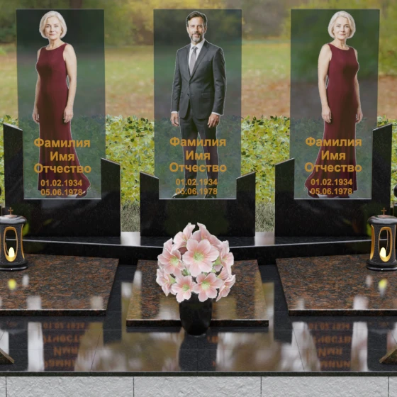 Оформление: Для стел такой формы идеальным решением станет классическая глубокая гравировка с покрытием сусальным золотом. Высокие вертикальные плоскости позволяют расположить портреты в полный рост или крупные погрудные изображения, сохраняя при этом достаточно места для эпитафий и декоративных символов. Золочение букв будет эффектно контрастировать с темными видами гранита, подчеркивая статус и торжественность мемориала.