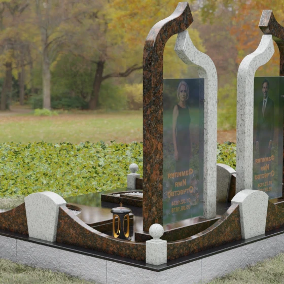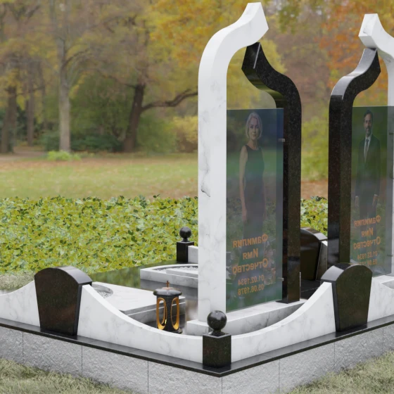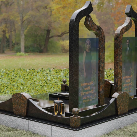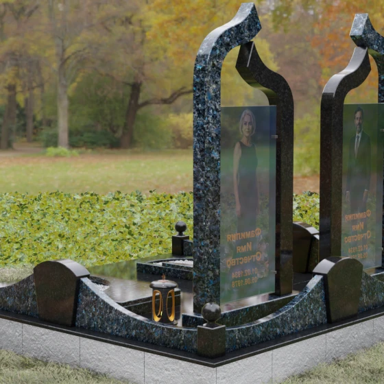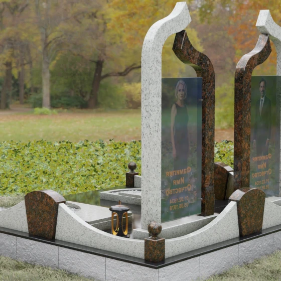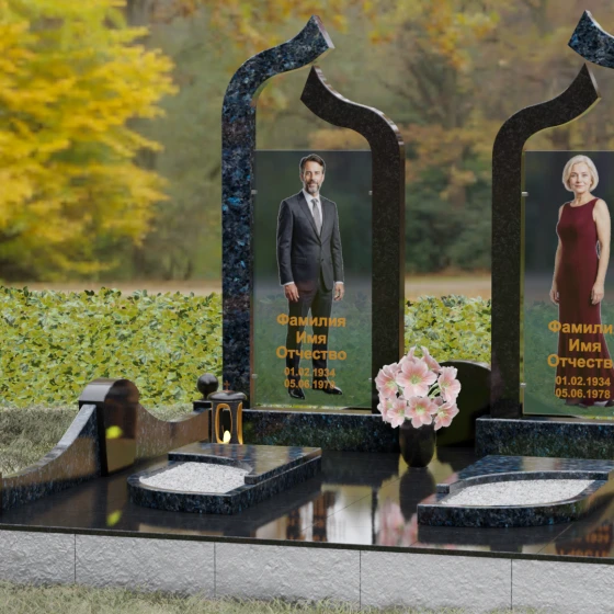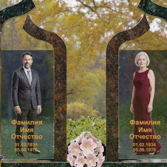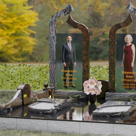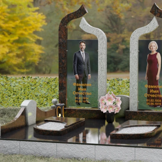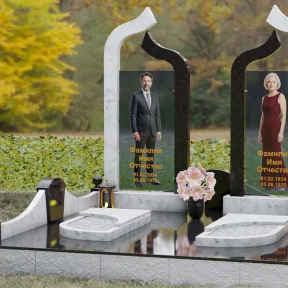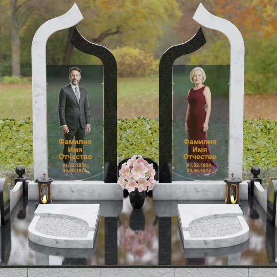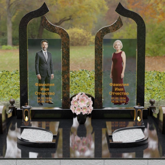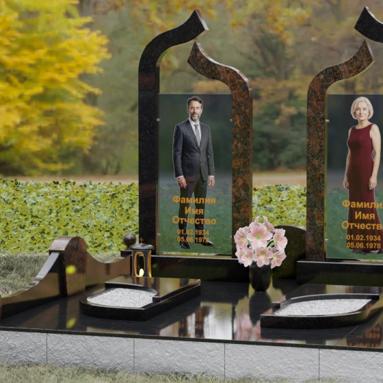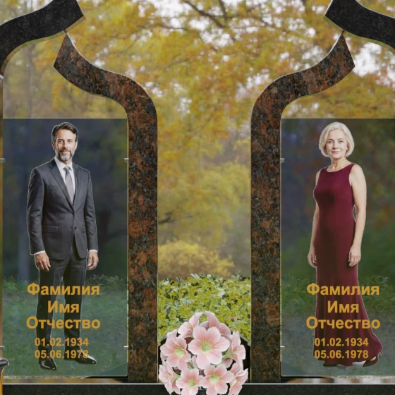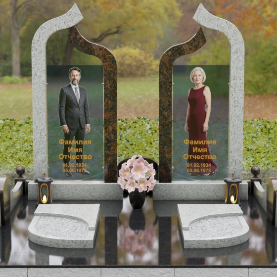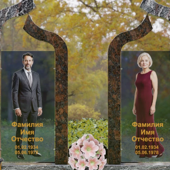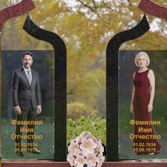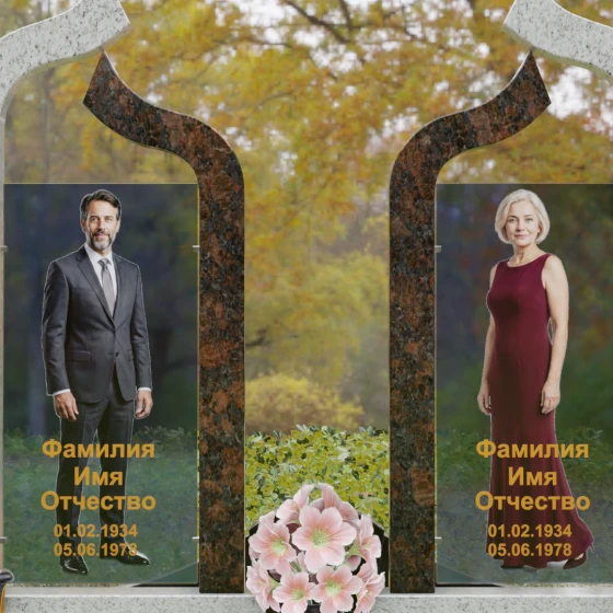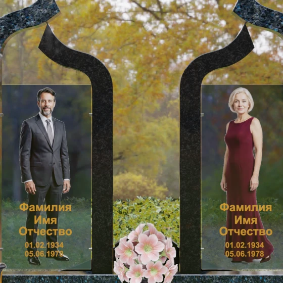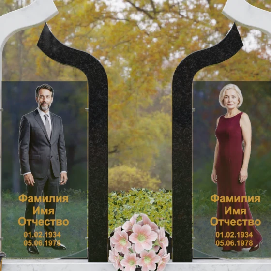 Оформление: Учитывая современную форму конструкции, я рекомендую использовать для этой модели широкоформатные портреты в полный рост, выполненные методом фотокерамики или художественной печати на стекле, как показано на образце. Это придает мемориалу глубину и реалистичность. Шрифт для ФИО и дат лучше выбрать классический, с глубокой рубкой и покрытием сусальным золотом или бронзой — это подчеркнет премиальный статус надгробия и обеспечит отличную читаемость на фоне любой фактуры камня.