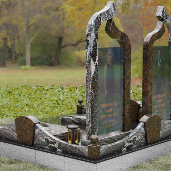 Этот эксклюзивный гранитный монумент (Артикул 256) является подлинным шедевром мемориальной архитектуры. Как мастер, посвятивший десятилетия работе с твердыми породами, я вижу в этой модели идеальный баланс между монументальностью и воздушностью. Композиция построена на безупречной симметрии двух зеркальных частей, которые словно оберегают покой ушедших. Центральные элементы ансамбля обрамлены изящными резными арками, чьи плавные, изогнутые линии напоминают купола или сложенные в молитве руки. Особое внимание уделено обработке граней: каждый изгиб тщательно отполирован до зеркального блеска, что создает завораживающую игру света на поверхности камня.