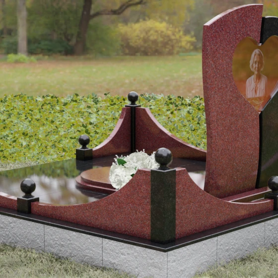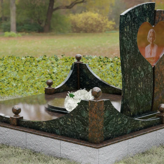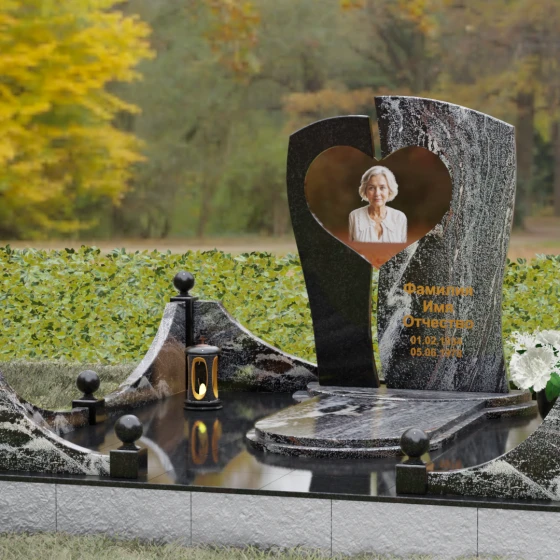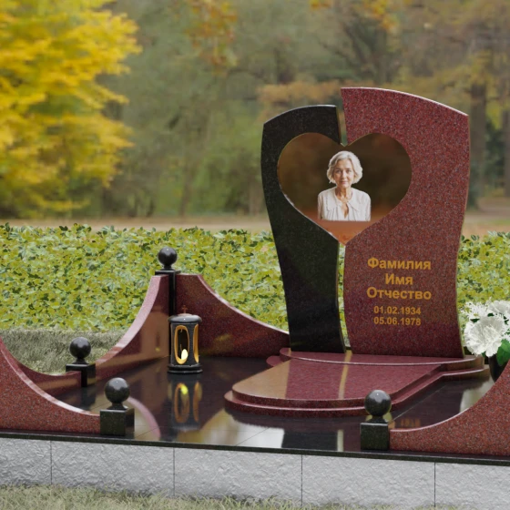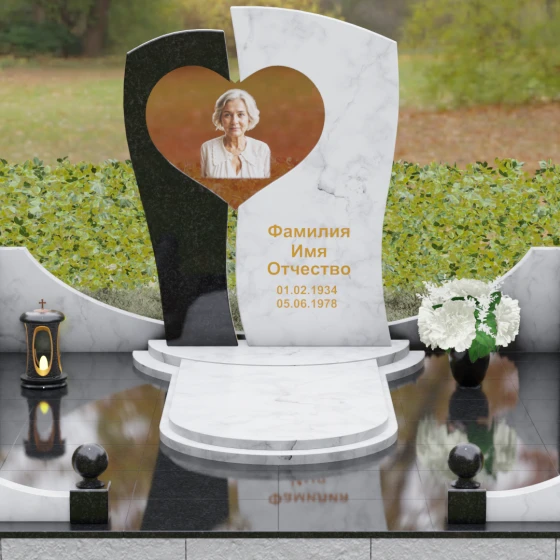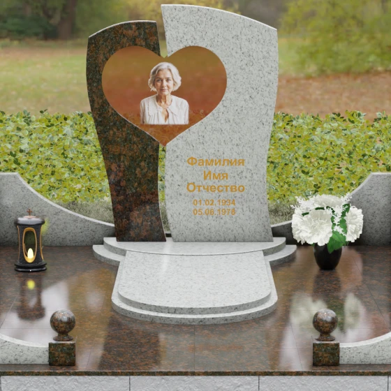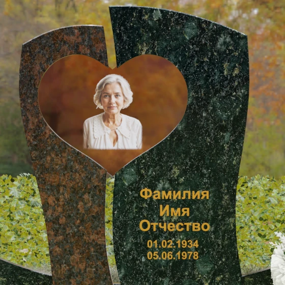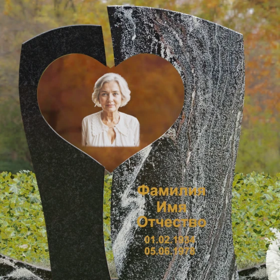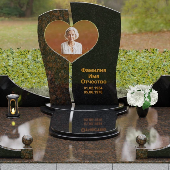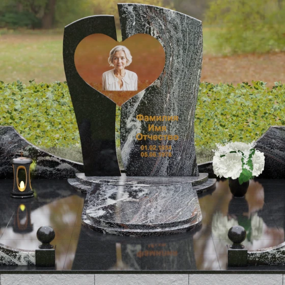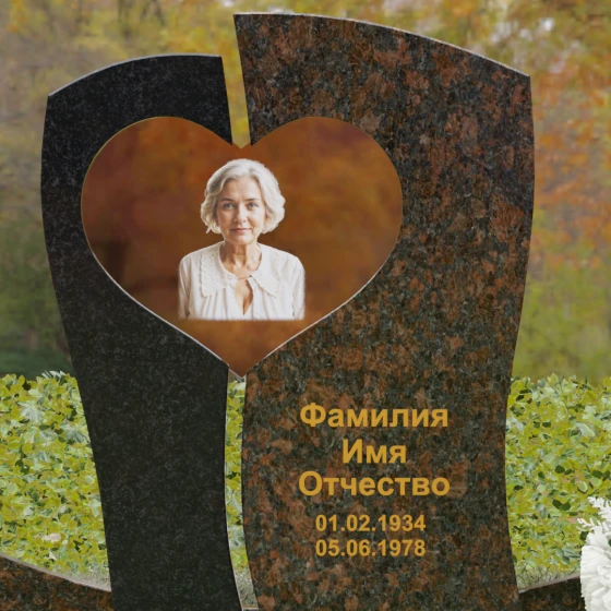 Эксклюзивный памятник (Артикул 259) — это не просто монумент, а глубокое художественное высказывание, воплощенное в благородном материале. Центральной темой композиции является безусловная любовь и единство душ, что находит свое отражение в уникальной форме стелы. Две асимметричные части монумента, выполненные из контрастных видов камня, плавно сходятся друг к другу, образуя в центре идеально выверенный силуэт сердца. Этот просвет служит своеобразным «окном в вечность», обрамляющим портрет близкого человека. Мягкие, волнообразные изгибы верхних граней символизируют жизненный путь — порой тернистый, но завершающийся покоем и гармонией. Тщательная зеркальная полировка лицевых поверхностей создает игру бликов, в которой отражается мир, подчеркивая живую связь между прошлым и настоящим.