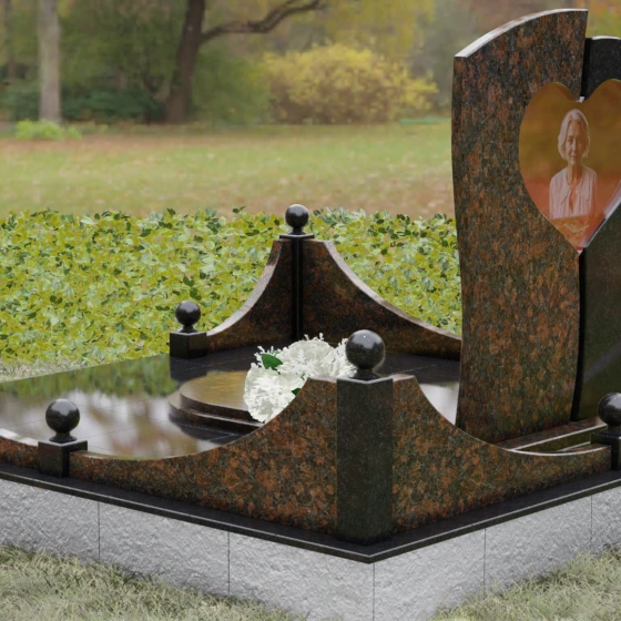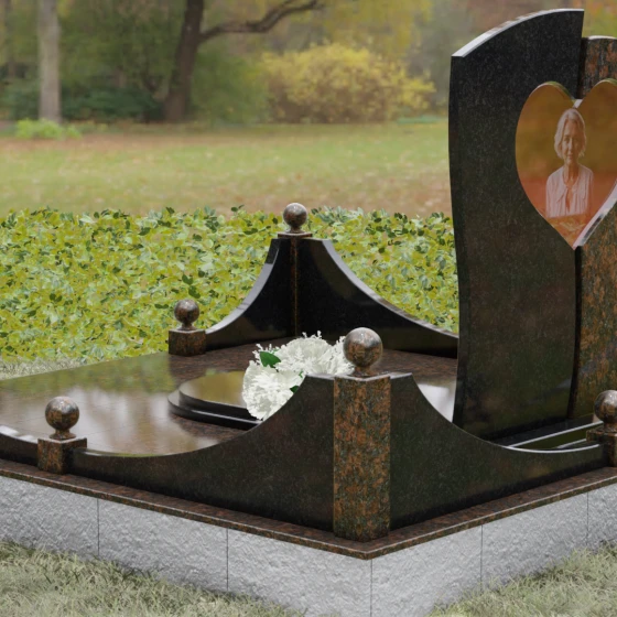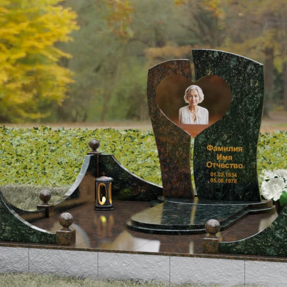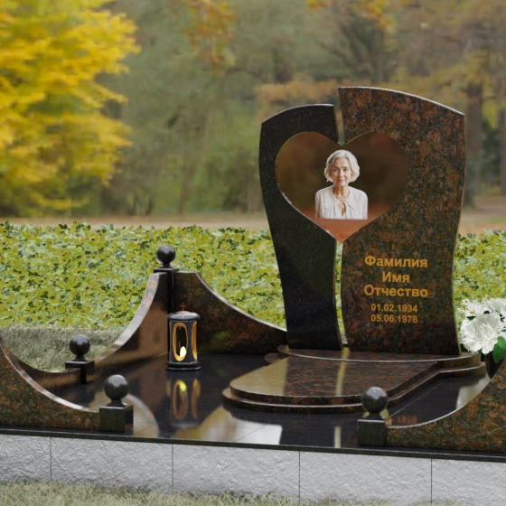 Оформление: Данная форма идеально подходит для размещения портрета в центре «сердца». Мы рекомендуем использовать керамику высокого разрешения или художественную гравировку с последующим покрытием «антидождь». Золоченая гравировка ФИО (как представлено на образце) на темном фоне камня выглядит особенно торжественно и благородно, гармонируя с теплыми оттенками комбинированных вставок. Завершенность участку придает надгробная плита, полностью закрывающая грунт: это не только выглядит эстетично и чисто, но и значительно упрощает уход за местом захоронения, избавляя от необходимости борьбы с сорняками.