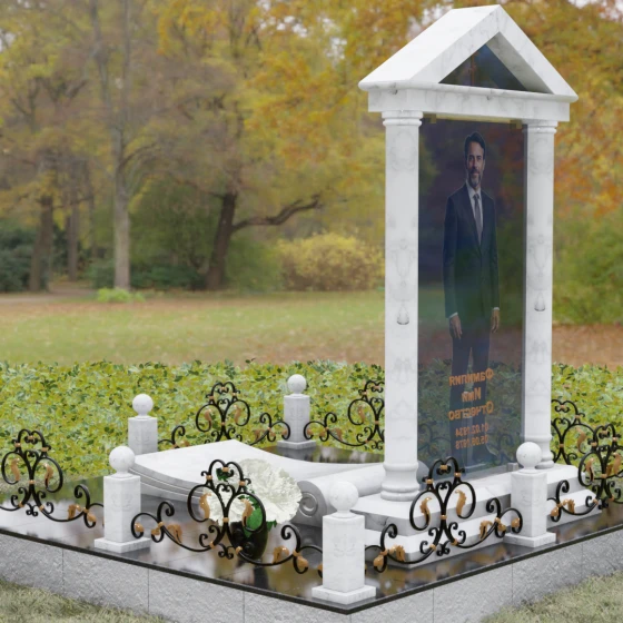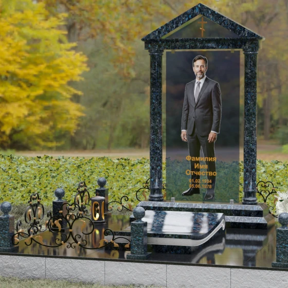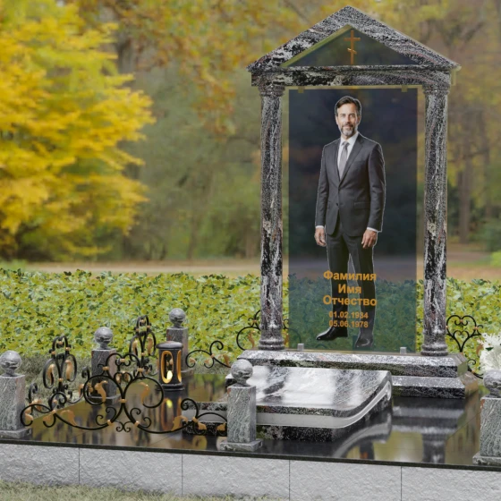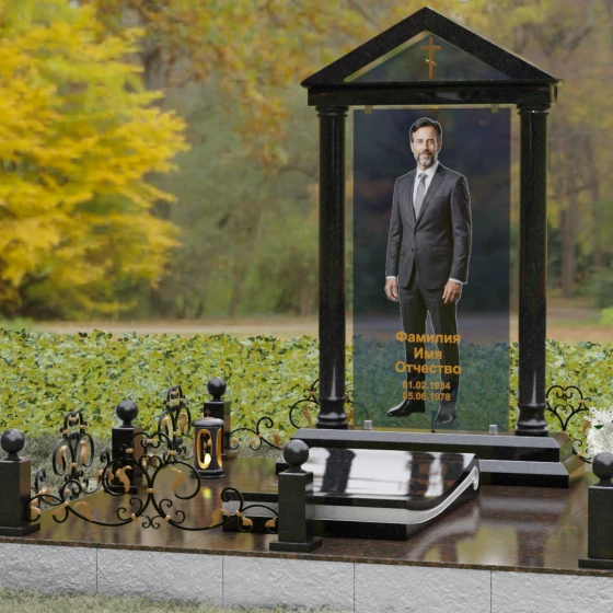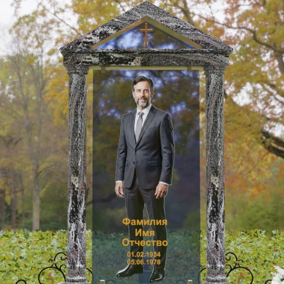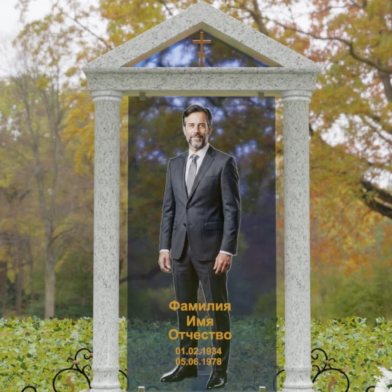 Особого внимания заслуживает центральный элемент — прозрачная панель из высокопрочного стекла, заключенная между колоннами. На нее нанесен полноростовой портрет и художественный фон в виде лесного пейзажа. Это технологичное решение создает эффект присутствия и глубины, который недоступен при обычной гравировке на камне. Пейзаж с изображением деревьев, нанесенный на внутреннюю часть композиции, символизирует единение души с природой и покой.