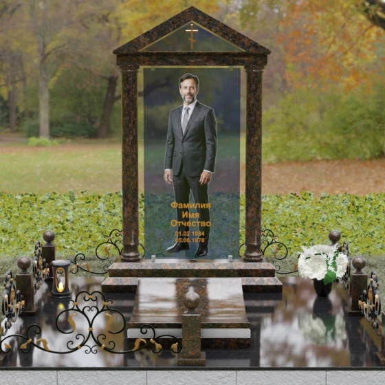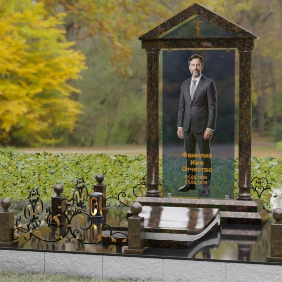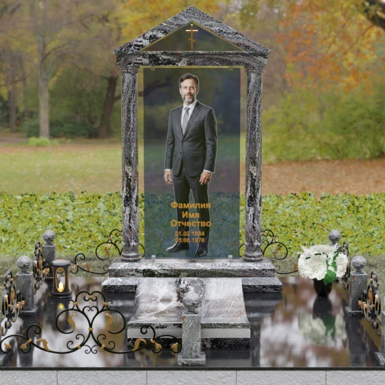 Данное ритуальное изделие представляет собой сложную архитектурную композицию, выполненную в величественном стиле античного портала или православной часовни. В центре художественного замысла лежит идея «окна в вечность»: два массивных гранитных столба с идеальной круговой полировкой поддерживают классический треугольный фронтон. Венчает эту строгую конструкцию лаконичный православный крест, чей силуэт четко выделяется на фоне неба. Использование колонн придает надгробию объем и монументальность, превращая место захоронения в сакральное пространство, защищенное каменными сводами.
