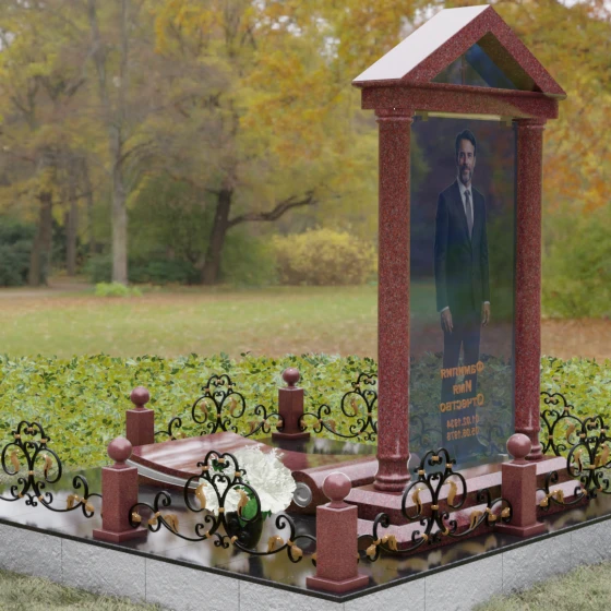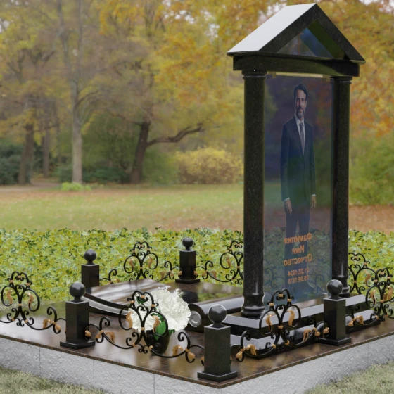 Комплексное благоустройство участка выполнено в едином ансамбле с центральным сооружением. Основание покоится на прочном гранитном цоколе, который надежно фиксирует всю конструкцию. Периметр обозначен низким каменным ограждением с массивными столбиками, каждый из которых увенчан идеально отполированным декоративным шаром. Шары — древний символ бесконечности и завершенности жизненного пути. Вставки из кованого металла в ограждении добавляют композиции легкости и ажурности, не нарушая общей строгости. Вместо открытого грунта используется сплошное мощение или закрытая надгробная плита, что обеспечивает безупречный вид участка на десятилетия и значительно упрощает уход за ним.
