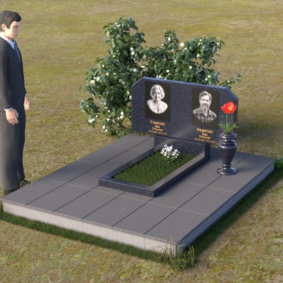 Этот ритуальное изделие (артикул ПГ027) – это не просто надгробный памятник, это способ выразить вашу любовь и уважение к ушедшему близкому человеку. Его строгая, но в то же время элегантная форма, с аккуратно скошенными углами верхней части, символизирует сдержанную скорбь и вечную память. Зеркальная полировка черного камня создает эффект глубины и объема, отражая небо и окружающий мир, словно напоминая о том, что душа усопшего нашла свой покой. Прямоугольная стела, установленная на подставке, выглядит лаконично и достойно. На полированной поверхности отчетливо видны портреты усопших, выгравированные с высокой точностью и детализацией. Композицию завершает ваза из того же материала, в которой можно разместить живые или искусственные цветы, как символ непреходящей любви и памяти. Одинокий красный мак, помещенный в вазу на изображении, служит трогательным акцентом, напоминающим о хрупкости жизни и необходимости ценить каждый момент.