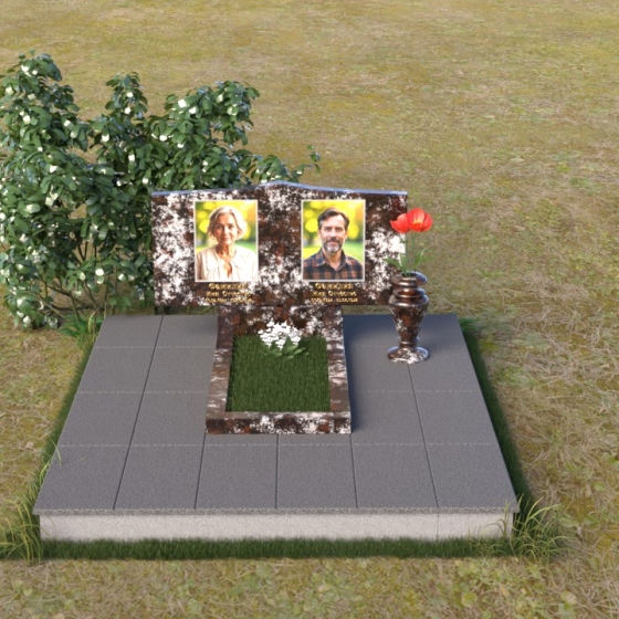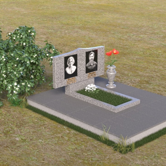 Эта модель воплощает собой сдержанную элегантность и монументальность, создавая ощущение умиротворения и вечной памяти. Величественная стела, выполненная в строгих геометрических формах, словно хранит в себе невысказанные слова, а ее плавные изгибы смягчают строгость линий, напоминая о тепле и заботе. Верхняя часть стелы имеет волнообразный изгиб, что придает ей легкость и визуально облегчает массивность камня. Зеркальная полировка поверхности отражает свет, создавая ощущение глубины и подчеркивая благородство материала. Лаконичность дизайна позволяет сосредоточиться на главном – на светлых образах ушедших, запечатленных в портретах, и на теплых словах, нанесенных золотым шрифтом. Эта композиция не кричит о скорби, а шепчет о вечной любви и светлой памяти.