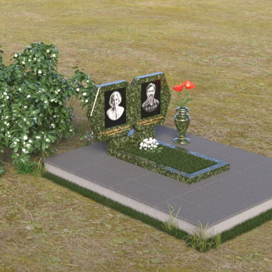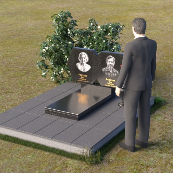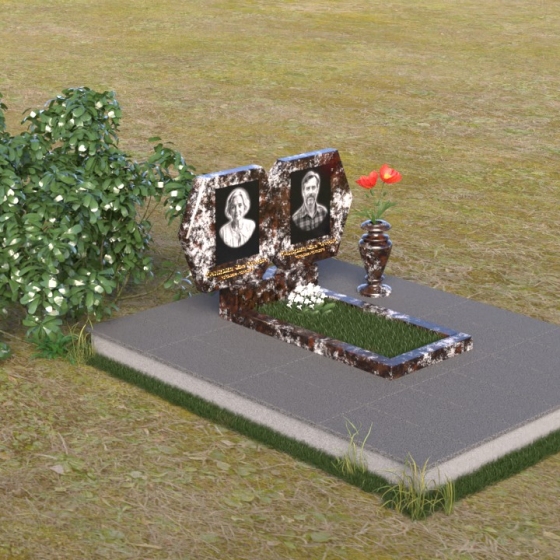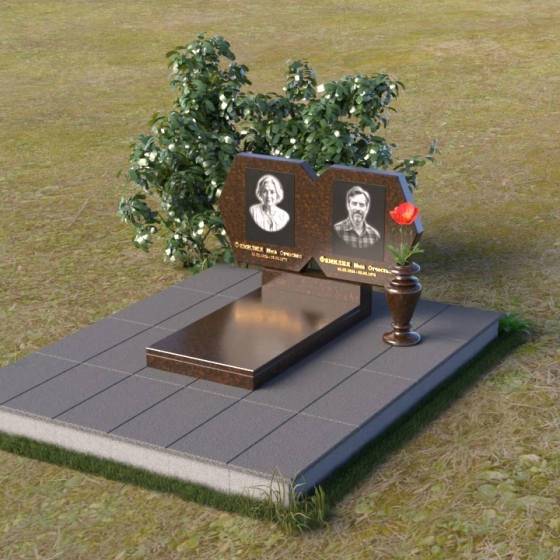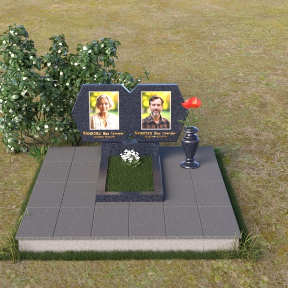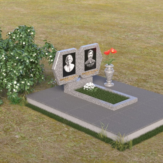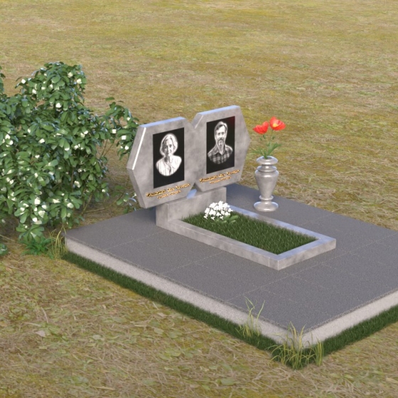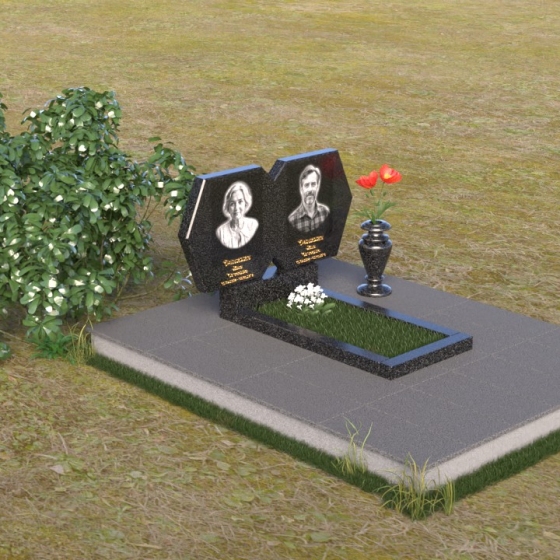 Этот памятник – пример элегантной простоты и сдержанного величия. Величественная стела состоит из двух симметричных частей, соединенных в верхней точке, образуя гармоничный и цельный образ. Верхняя часть каждой стелы имеет форму, близкую к шестиугольнику, с аккуратно скошенными углами, придающими ей мягкость и благородство. Боковые грани обеих частей стелы тщательно отполированы до зеркального блеска, что создает потрясающую игру света и тени, подчеркивая глубину и объем камня. Фаски, снятые по периметру, добавляют скульптурности и изящества. Нижняя часть стелы, где располагаются имена и даты, выполнена в строгой прямоугольной форме, что создает визуальный контраст с более сложной верхней частью и акцентирует внимание на надписях. Вся композиция установлена на массивной горизонтальной плите, также выполненной из полированного гранита, что придает памятнику устойчивость и основательность.