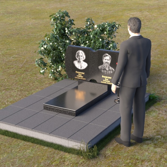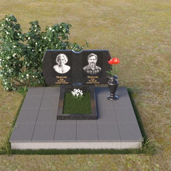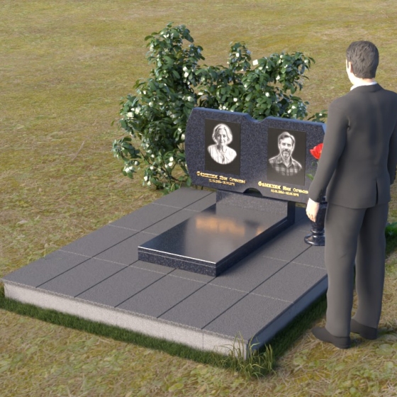 Этот гранитный монумент воплощает в себе строгость и элегантность, создавая достойное обрамление памяти. Лаконичная форма верхней плиты, сочетающая в себе плавные изгибы и прямые линии, словно рассказывает историю жизни, полную как светлых, так и трудных моментов. Зеркальная полировка черного гранита притягивает взгляд, отражая небо и окружающий мир, создавая ощущение глубины и вечности. Контраст полированной поверхности с выгравированными портретами создает эффект объемности и реалистичности, позволяя сохранить дорогие черты ушедших близких. Сдержанный дизайн памятника позволяет ему гармонично вписаться в любой ландшафт, не нарушая тишину и покой места упокоения.