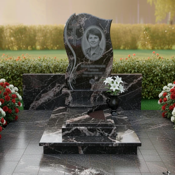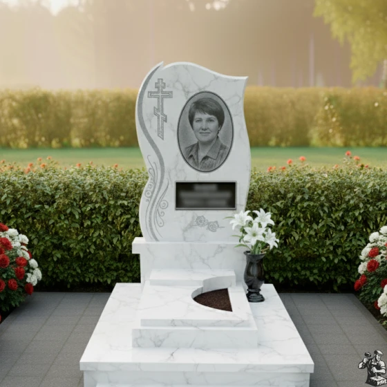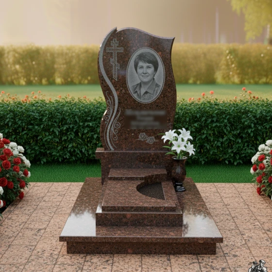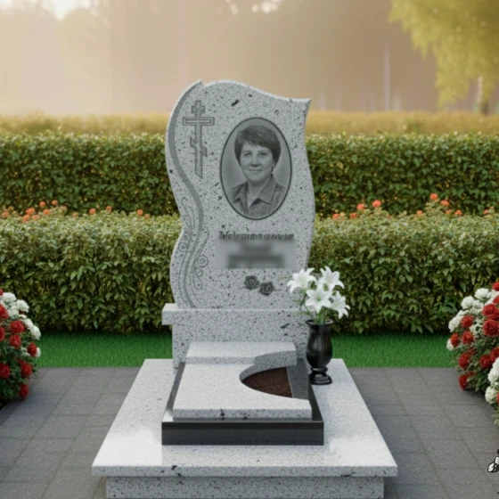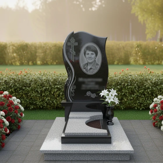 • Стела: Изогнутая форма с полированными краями и декоративными элементами в виде растительного орнамента, добавляющими изящество. В верхней части стелы расположен православный крест.