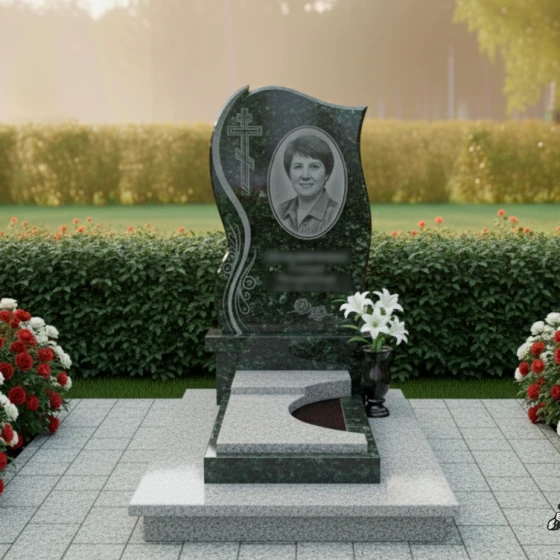 Конструкция памятника продумана таким образом, чтобы обеспечить его долговечность и простоту в уходе. Плавные формы препятствуют скоплению грязи, а закрытая плита надгробия позволяет избежать прорастания сорняков. Для портрета на стеле рекомендуется использовать гравировку с последующей обработкой акриловыми красками или сусальным золотом, что придаст изображению выразительность и долговечность.