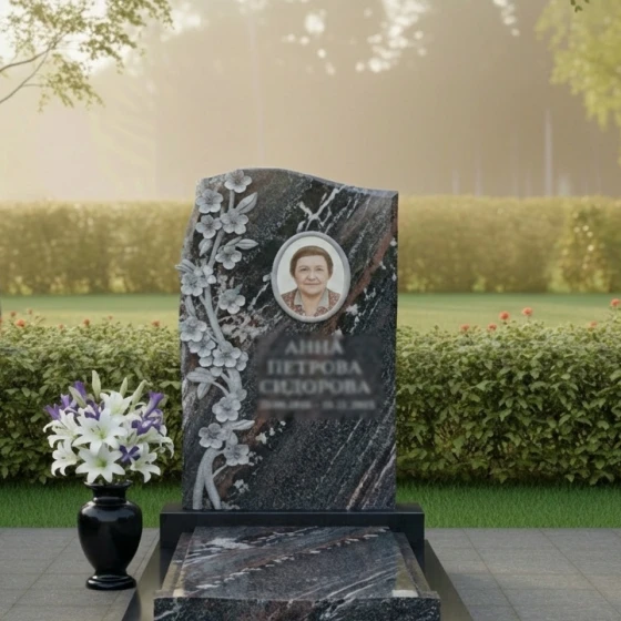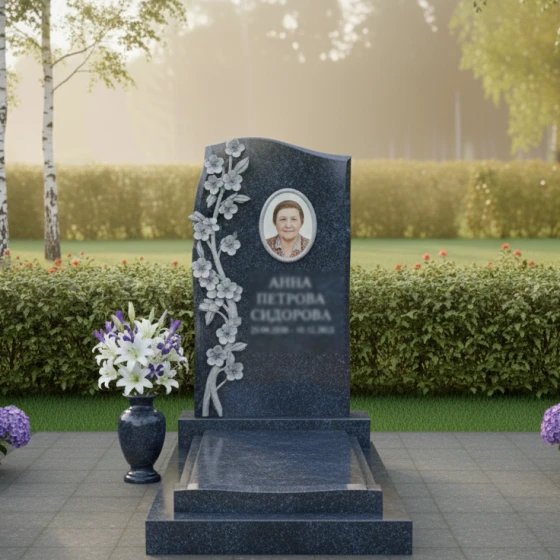 Особое внимание привлекает богатая художественная резьба, украшающая левую сторону стелы. Здесь расцветает пышная ветвь с крупными, объемными цветами, каждый лепесток которых проработан с ювелирной точностью. Цветы, напоминающие нежные розы или пионы, кажутся живыми благодаря игре света на их полированных поверхностях и контрасту с матовыми, слегка шероховатыми участками камня, имитирующими естественную текстуру. Эта игра фактур — глянцевой полировки и бархатистой матовости — придает композиции объем и выразительность. Резные элементы словно оживают на черном зеркальном фоне, притягивая взгляд и приглашая к созерцанию. Такая детализация резьбы не только украшает монумент, но и придает ему индивидуальность, подчеркивая уникальность ушедшего человека.