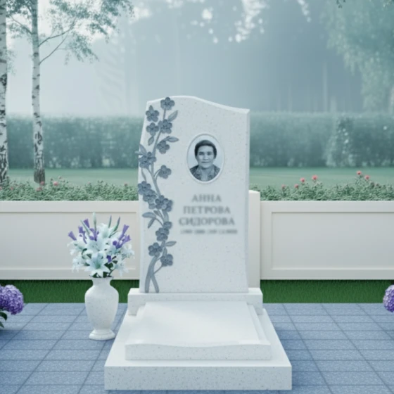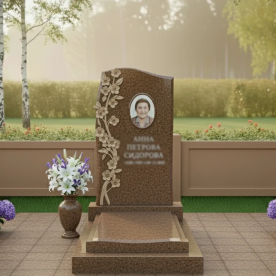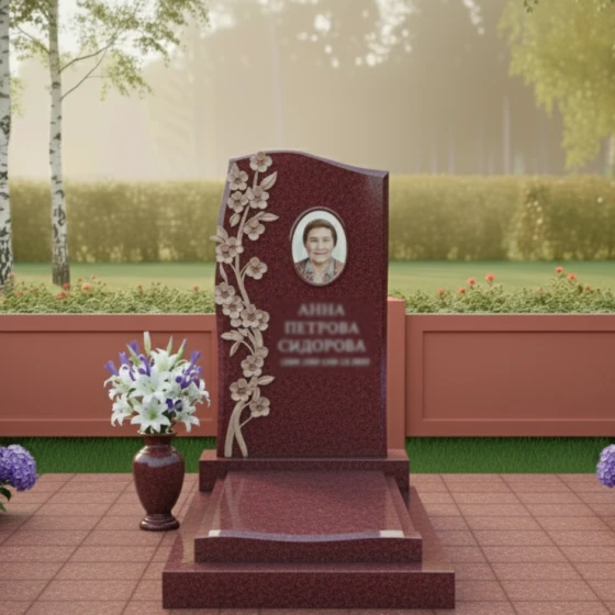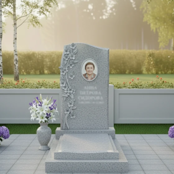 Монумент установлен на массивный гранитный цоколь, который не только придает конструкции дополнительную устойчивость, но и создает завершенный, монументальный вид. Цоколь имеет строгую прямоугольную форму с аккуратно обработанными гранями, что идеально гармонирует с плавными линиями стелы, создавая баланс между классической строгостью и мягкой элегантностью. Надгробная плита, выполненная в едином стиле со стелой, полностью покрывает участок, что не только эстетично, но и значительно упрощает уход за местом упокоения, сохраняя его опрятный вид на долгие годы. Завершает композицию изящная каменная ваза, расположенная у подножия стелы. Ваза, выполненная из того же материала, что и весь комплекс, имеет классическую форму с широким горлом и устойчивым основанием, позволяя разместить свежие цветы, символизируя непреходящую любовь и память.