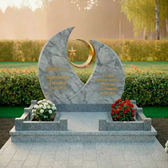 Модель ПН 157 представляет собой истинное произведение искусства, воплощенное в камне, призванное стать вечным символом памяти и уважения. Величественная стела, выполненная в глубоком черном цвете, мгновенно притягивает взгляд своей необычной, но гармоничной формой. Ее силуэт напоминает два полумесяца, обращенных друг к другу, создавая динамичную композицию, которая символизирует единство и бесконечность. В центре этой дуальности, словно небесное светило, парит золотистый полумесяц, в объятиях которого покоится изящная пятиконечная звезда. Этот центральный элемент выполнен с ювелирной точностью, его отполированная до зеркального блеска поверхность отражает свет, создавая ощущение невесомости и духовности. Грани стелы тщательно обработаны, демонстрируя безупречную гладкость и плавные переходы, которые подчеркивают естественную красоту камня. Зеркальная полировка черного гранита создает эффект глубокого космоса, в котором каждый луч света играет и преломляется, обещая сохранить свой первозданный блеск на столетия, неподвластный времени и стихиям.