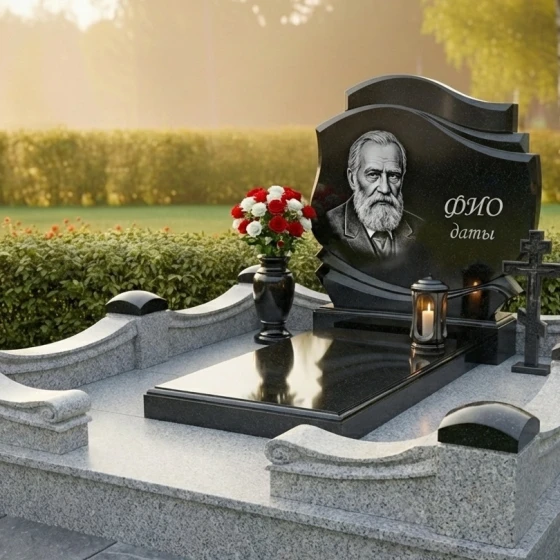 Ритуальное изделие Артикул: ПН 462 — это не просто камень, это произведение искусства, созданное для того, чтобы увековечить светлую память о дорогом человеке. Каждая линия, каждый изгиб этой композиции пропитаны глубоким смыслом и стремлением выразить безграничную любовь и уважение. Перед нами предстает величественная стела, выполненная в благородном черном цвете, который символизирует глубину скорби и одновременно незыблемость вечной памяти. Ее форма представляет собой гармоничное сочетание плавных волн и строгих линий, создающих ощущение динамики и одновременно спокойствия. Верхняя часть стелы словно парит, образуя изящные изгибы, напоминающие страницы открытой книги или легкие складки драпировки, что придает изделию особую выразительность и утонченность. Грани стелы тщательно отполированы до зеркального блеска, отражая окружающий мир и создавая игру света и тени, которая придает камню живое сияние. В центре стелы, на идеально гладкой поверхности, выгравирован портрет усопшего — лик, полный мудрости и спокойствия, выполненный с невероятной детализацией, передающей каждую черточку лица и глубину взгляда. Рядом с портретом, словно нежное напоминание о жизненном пути, расположены ФИО и даты жизни, выполненные элегантным шрифтом.