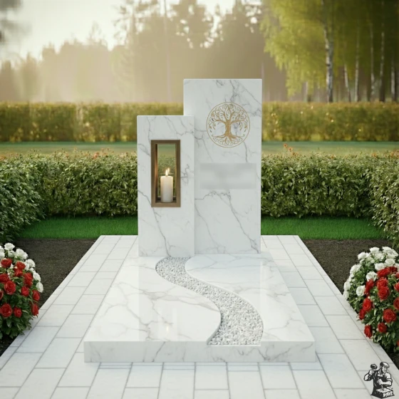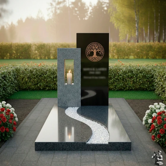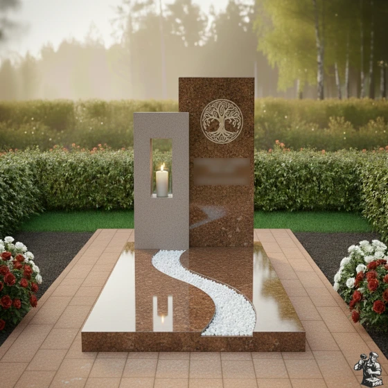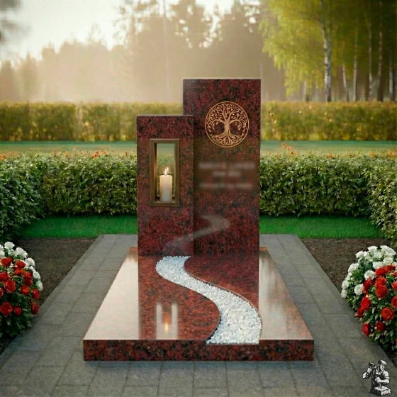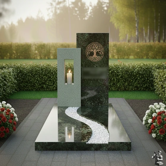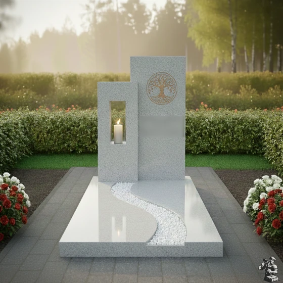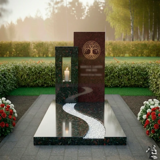 Данная мемориальная композиция (Артикул: 626) представляет собой образец современной архитектуры малых форм, где строгость геометрии встречается с природной плавностью линий. В центре архитектурного ансамбля находятся две вертикальные стелы разной высоты, создающие динамичную асимметрию. Левая часть комплекса выполнена из контрастного светлого гранита и дополнена функциональной нишей — вырубленным в камне сквозным окном для установки лампады. Это решение позволяет игре света и тени буквально оживлять монумент: пламя свечи, защищенное гранитными стенками, отбрасывает мягкие блики на зеркально отполированные поверхности основного монумента. На главной стеле методом высокоточной гравировки нанесено изображение «Древа Жизни» — глубокий символ вечности, связи поколений и бессмертия души. Лаконичность форм подчеркивает статус и благородство, не перегружая визуальное восприятие лишними деталями.